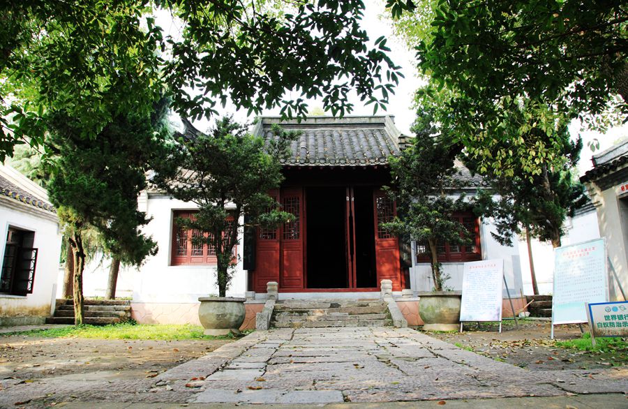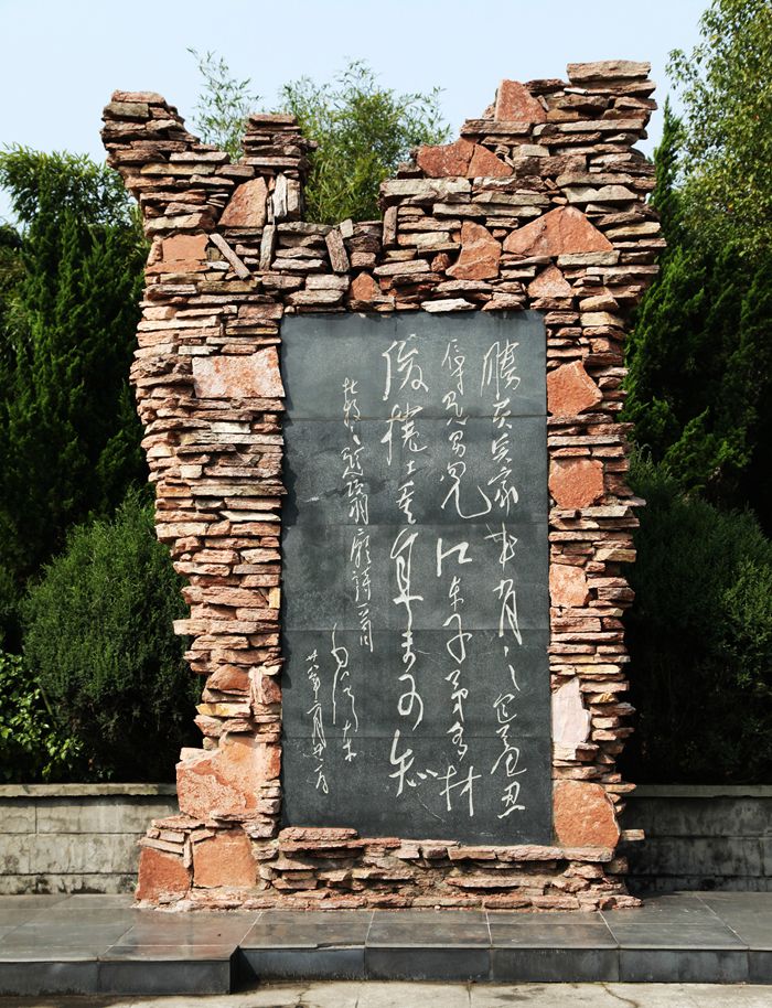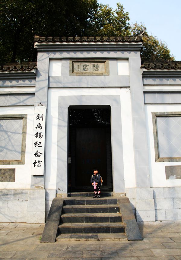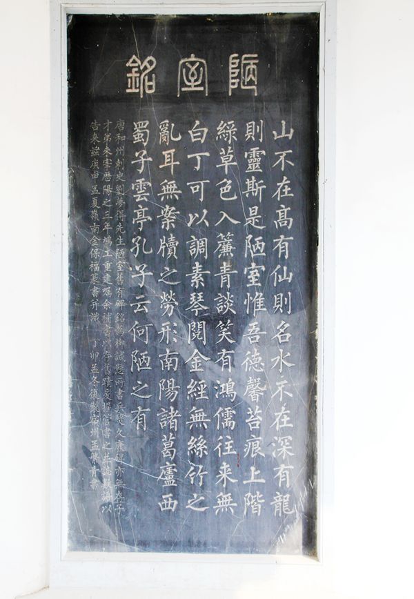 这首诗就刻在陋园的墙上,我依次参观诗人的陋室。这是3幢9间呈品状的房屋,主室斗拱飞檐,古雅别致,内有刘禹锡塑像。偏屋白墙墨瓦,简朴小巧,石铺小院,绿茵遍地。诗人就是在这里挥毫写下了千古绝唱的《陋室铭》。门首上方“陋室”两字出自著名诗人藏克家之手。陋室内存列着许多文物及名人书画等。那首流传千古的《陋室铭》碑立于院落的小厅内,这是是安徽书法家孟繁青仿柳体勒的《陋室铭》。