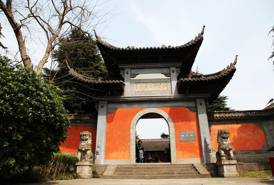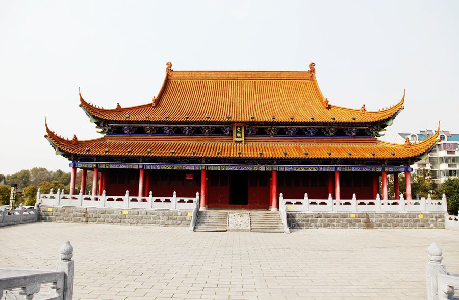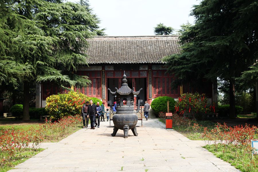 走出陋室,来到望江亭,这座亭子在陋室公园的山上,掩在绿树丛中,古色古香呈暗红色。我登上亭子眺望,四周被树木遮挡,什么也看不见,只好下来了。在陋室公园的广场上,还有一座金碧辉煌的大殿,供奉的是孔子,叫文庙殿。