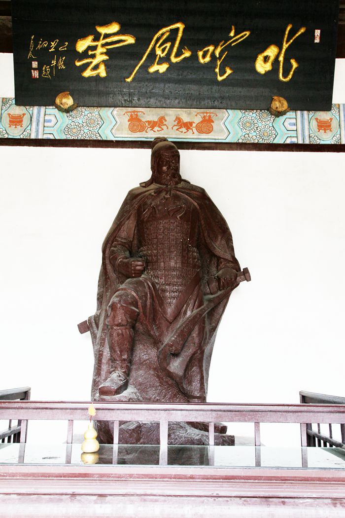 在正殿、享殿、东西殿陈列着历史文物,还有项羽巨幅雕塑,这位大英雄顶天立地的形象矗立在世人面前。身高1.90米,身披大氅,脚踏岩石,手握宝剑,目视前方,一股豪气冲天的样子。柱子上有字:“横批叱咤风云”,那威武的形象天下无敌。就是这个顶天立地的大英雄,却因骄傲自大,不能知人善任,结果一败涂地,无颜见江东父老,自刎乌江,死后身首八块被人抢夺邀功。尽管如此,项羽在人们的心中,依然是惊天地的盖世大英雄。