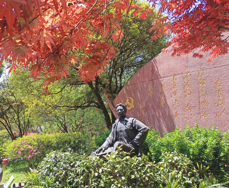 江泽民主席的题字圆润流畅,看着舒服。但我更希望看到辛老先生一位豪情满怀的将军的亲笔,但将军不曾像岳飞那样留下墨痕。真是遗憾。拍下一张照片后,我发现小院内还有辛一尊塑像,即去拍了下来。这一尊一手持剑,目宇轩昂,髭须稍少,仍不失儒将风范。