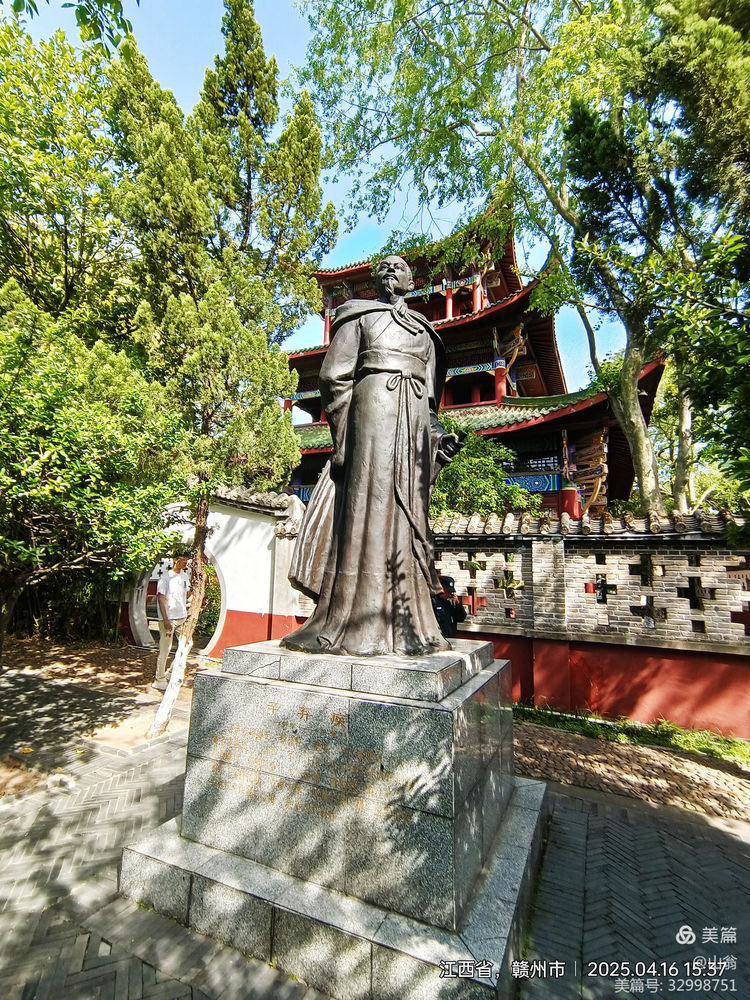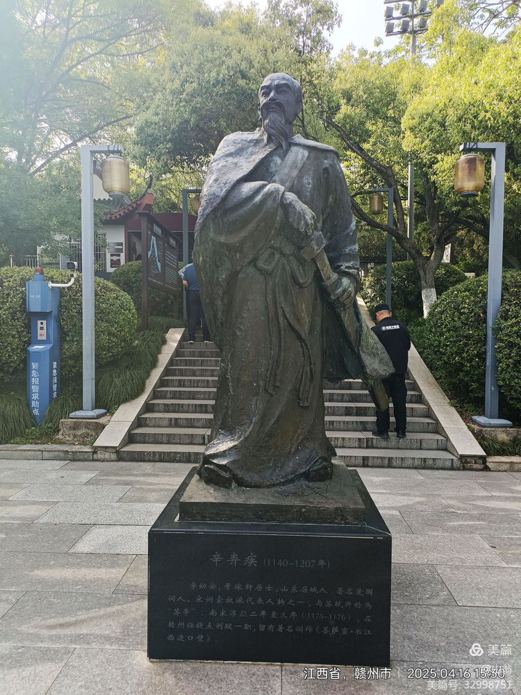 我拍下的第一张照片即是辛弃疾的塑像。辛弃疾(1140年——1207)祖上居甘肃陇西狄道西乡(今陇南市康乐县),到其五世祖时迁居济南方城。他是我喜爱的词人之一,我有“郁孤台”这个记忆,也是早年读他的“郁孤台下清江水”而致。而我最喜欢的词还是他那首被选入中学课本的《永遇乐•京口北固亭怀古》。从其生平看,他本是一位有勇有谋的将军,十八岁时就与人一起从金朝统辖地捉得一名叫张安国的叛徒交宁朝廷惩处。但入仕后多次遭坏人弹劾,怀才不遇。塑像底座上对其作了简要介绍,特地提到了他任赣州提点刑狱时(1175——1176年)写下的郁孤台词——《菩萨蛮•书江西造口壁》。仔细凭吊方发现,这尊塑像很有特色。辛弃疾浓眉慧眼,印堂宽大,髭須髯髯,俨然一美髯公也。只見他左手握剑鞘,右手拔剑欲出,披风后飘,突顯出其誓死如归的儒将风骨。此塑像最动人处当数作者辛老先生那一双慧眼的刻画,观者从其眼神可以看出辛一副忧国忧民的样子,充分展现了他历经坎坷、报国无门的一生。
