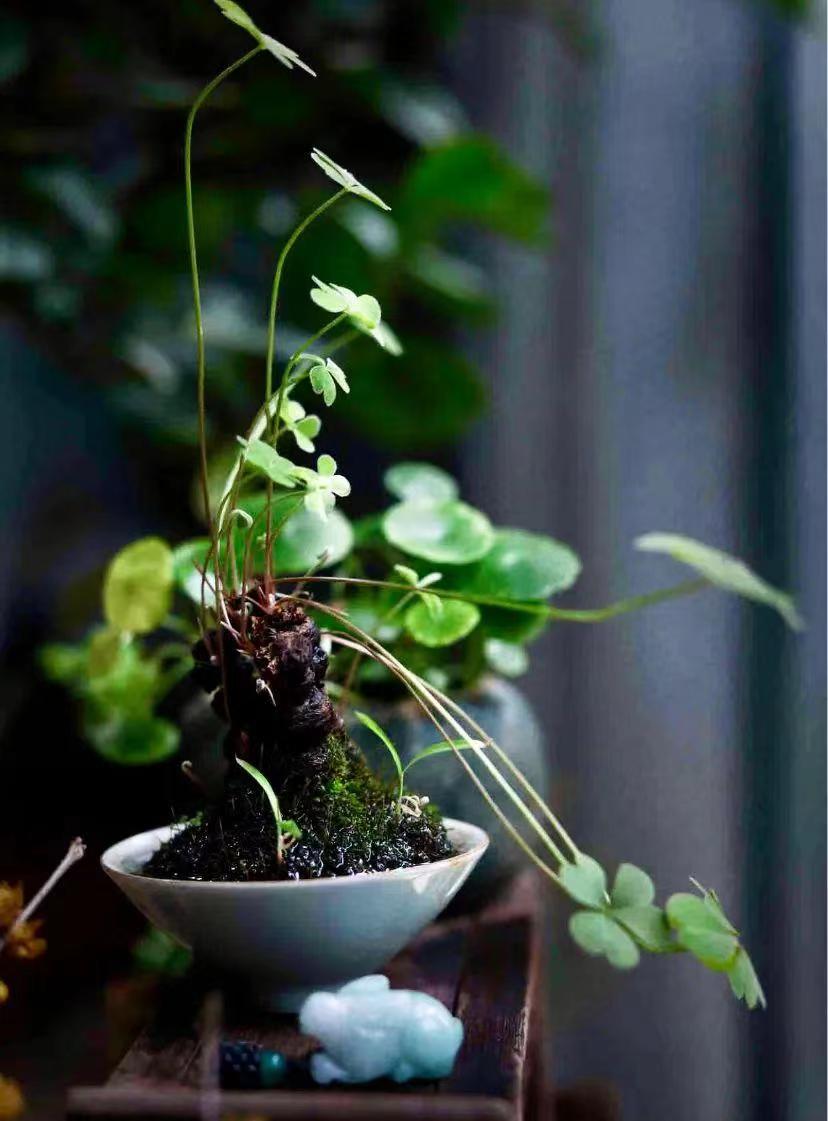 酢浆草挖回家后,稍微进行一番造型,就能打造出极具骨像美的盆景。