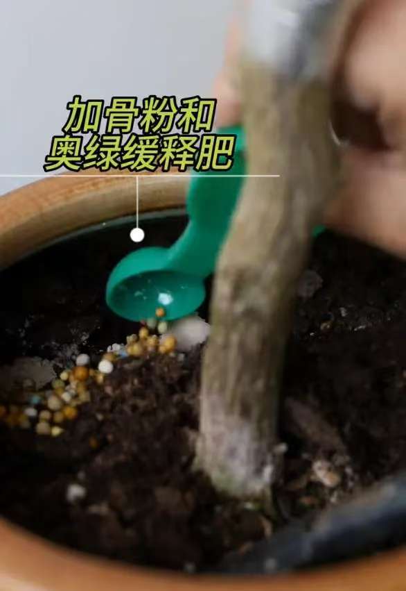在小沟里,撒入一些骨粉和奥绿缓释肥。骨粉富含磷和钙,可以促进花芽分化;奥绿缓释肥则能提供持续的基础养分,帮助三角梅稳定生长。