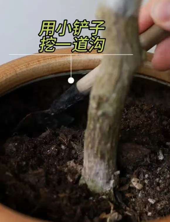 修剪后,用一把小铲子在花盆壁挖一条浅浅的小沟,注意不要伤到根系。