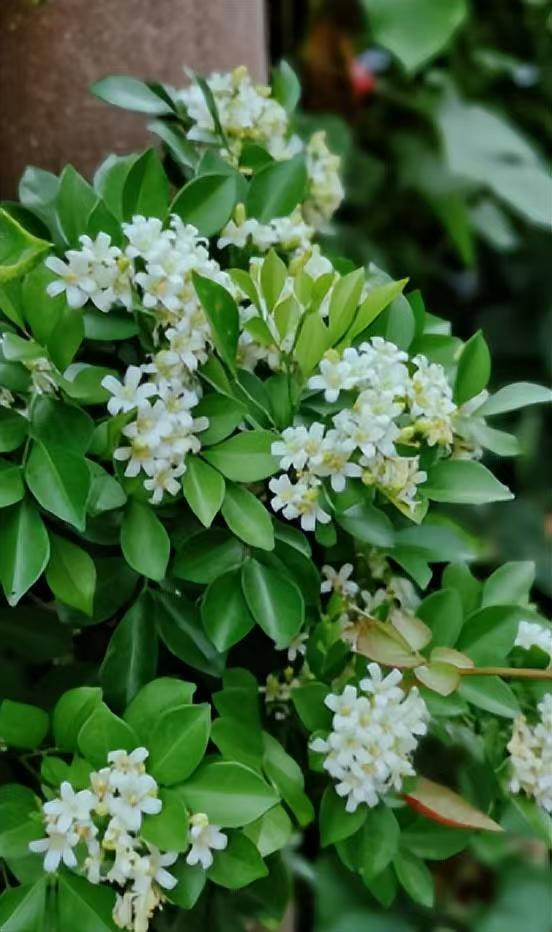 九里香也叫七里香,以香字命名的植物并不多,以香味的距离命名的花卉植物更少,可见九里香的香气多么浓郁了。九里香的叶片不大,和米兰花差不多相似,也是可以四季开花的。在养护过程中只需要光照充足,温度上去20度就可以持续不间断地开花,花开了一茬又一茬,它的香味儿特别浓郁。