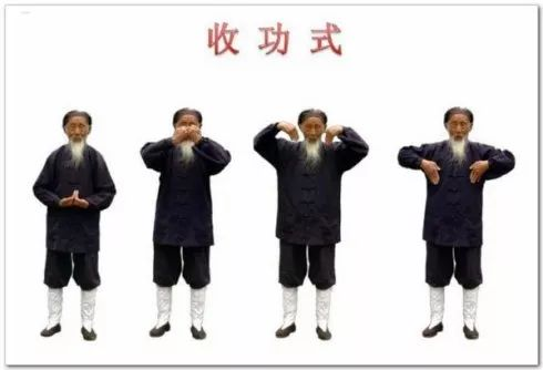 6.结束时,头部转回到胸前中线,稍停后,慢慢睁开两眼,翻掌,掌心向上,提至脐部,转掌使掌心向内,气归下丹田。两手分开,握拳,掌心向上,相对于肚脐处。