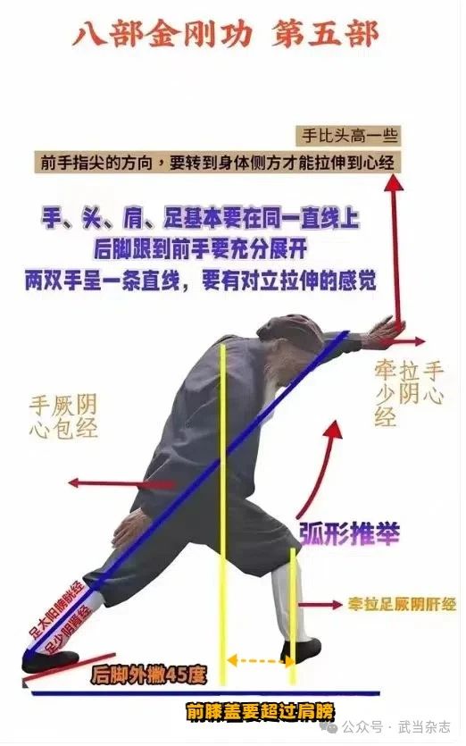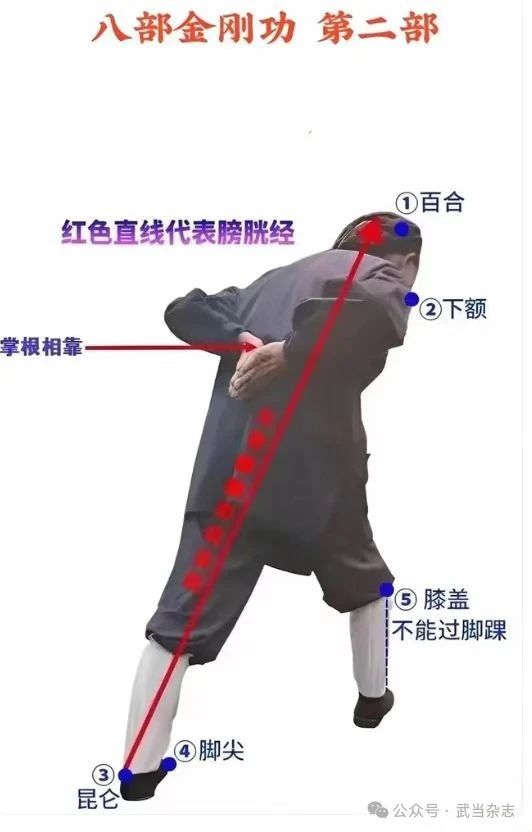 此部功法可刺激手少阴心经、膀胱经。手少阴心经对于心经所走行部位引起的病症都有治疗作用,膀胱经也有很好加强脏腑功能、调节精神情志、改善机体状态的作用。