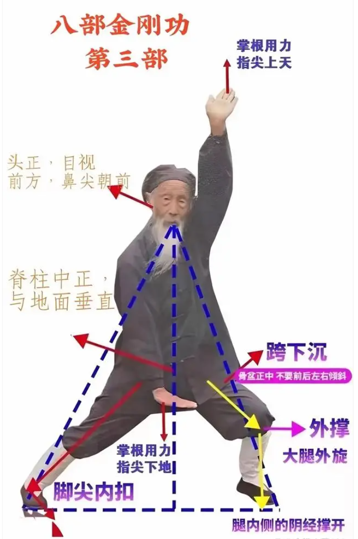 此部动作由于绷直机体躯干、双臂,从而活动刺激了手三阴、手三阳、足三阴、足三阳经络,调养气虚血虚,可健脾益气、增补后天气血生化之源,使气血化生源源不断、四肢百骸、脏腑均得以滋养,从而延缓人体的衰老。
