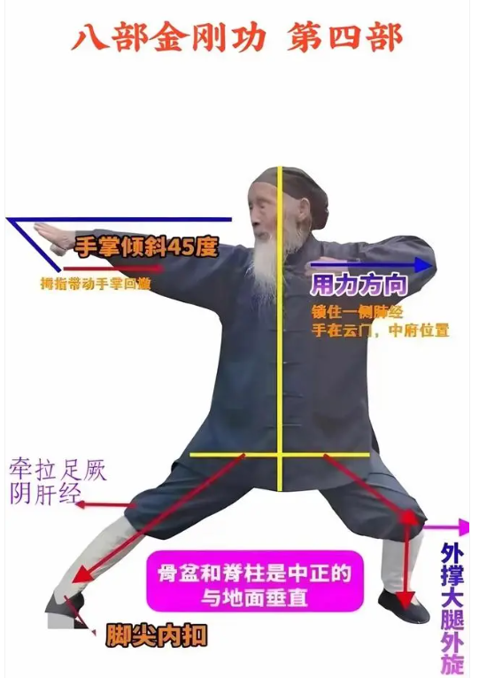 本部动作通过拧转内脏在身体表面经络,由表及里,由外向内,疏通淤堵,提高对内脏气血输送量,让内脏进行自我修复,调脏腑,平阴阳,和气血。