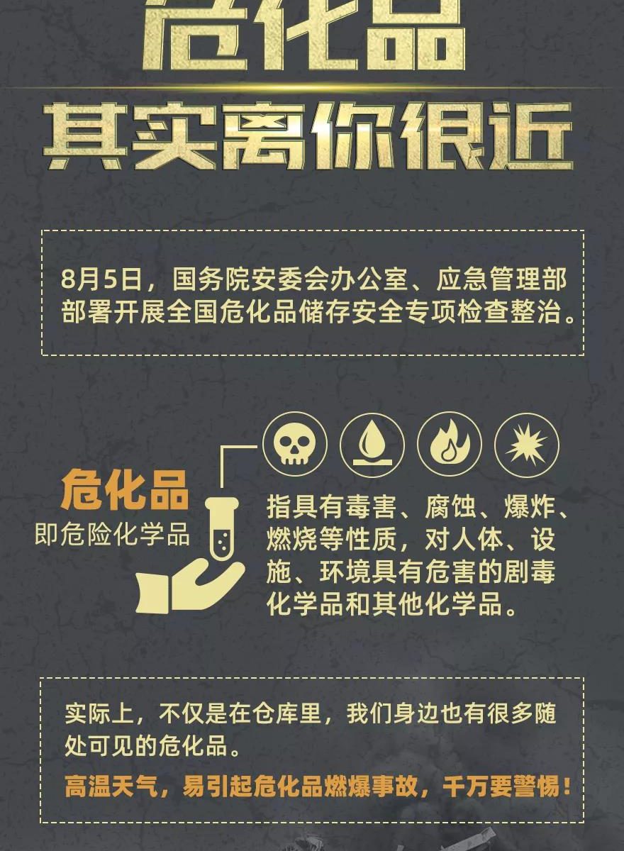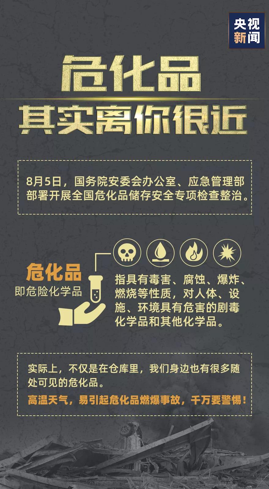 8月5日,国务院安委会办公室、应急管理部召开了全国安全生产专题视频会议,要求深刻吸取黎巴嫩贝鲁特重大爆炸事件教训,深入开展天津港“8·12”等重特大事故整改措施落实情况“回头看”;强调要以港口、码头、物流仓库、化工园区等为重点,立即开展全国危化品储存安全专项检查整治。