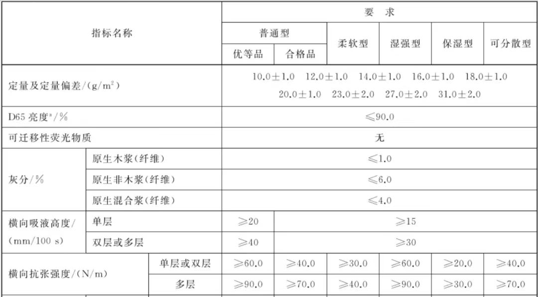 纸巾性能要求部分表(图/国家标准截图)