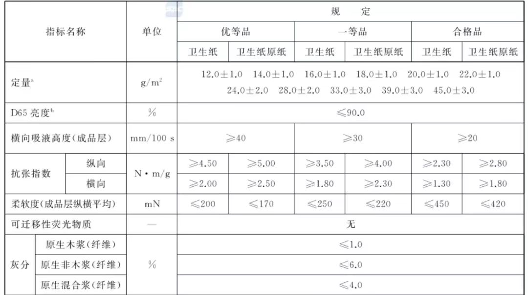 原生浆(纤维)卫生纸和卫生纸原纸技术指标部分内容(图/国家标准截图)