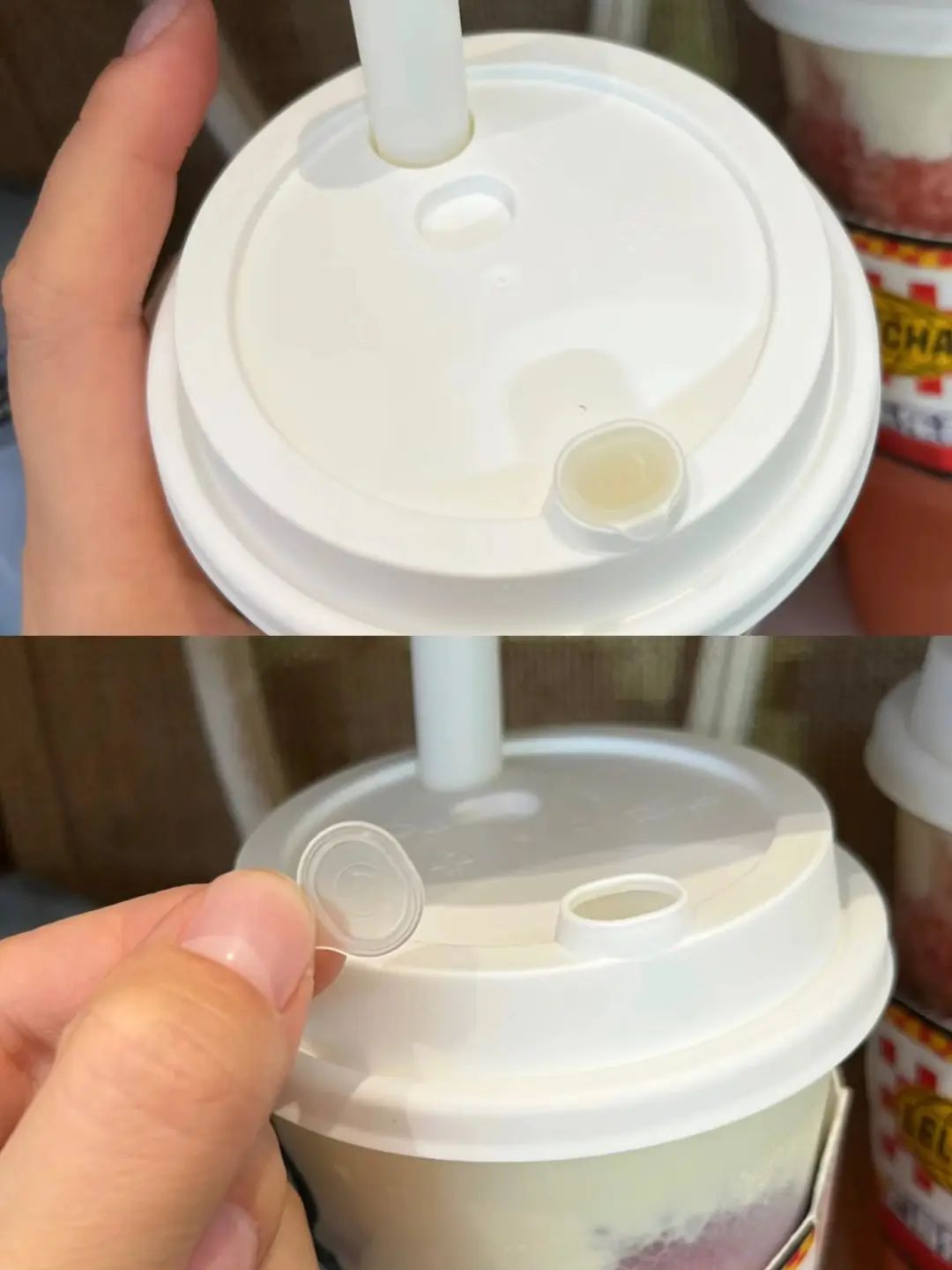 其作用是某些奶茶有奶盖,这个小盖子打开,方便喝奶盖。