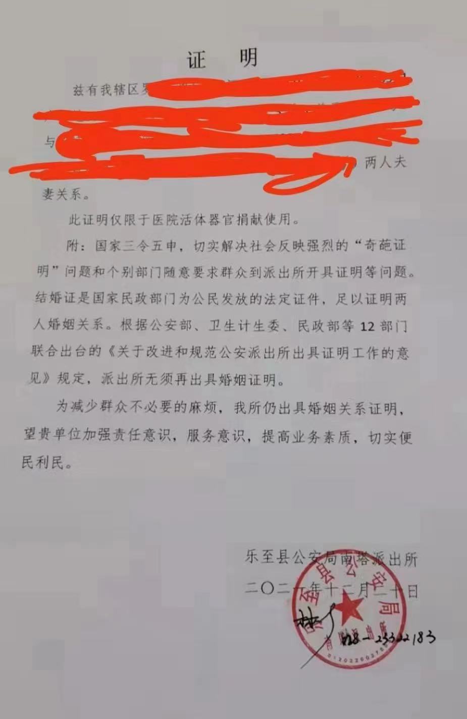 证明中提到,此证明仅限于医院活体器官捐献使用。证明最后还有附文称,国家三令五申,切实解决社会反映强烈的“奇葩证明”问题和个别部门随意要求群众到派出所开具证明等问题。结婚证是国家民政部门为公民发放的法定证件,足以证明两人婚姻关系。根据公安部、卫生计生委、民政部等12部门联合出台的《关于改进和规范公安派出所出具证明工作的意见》规定,派出所无须再出具婚姻证明。
