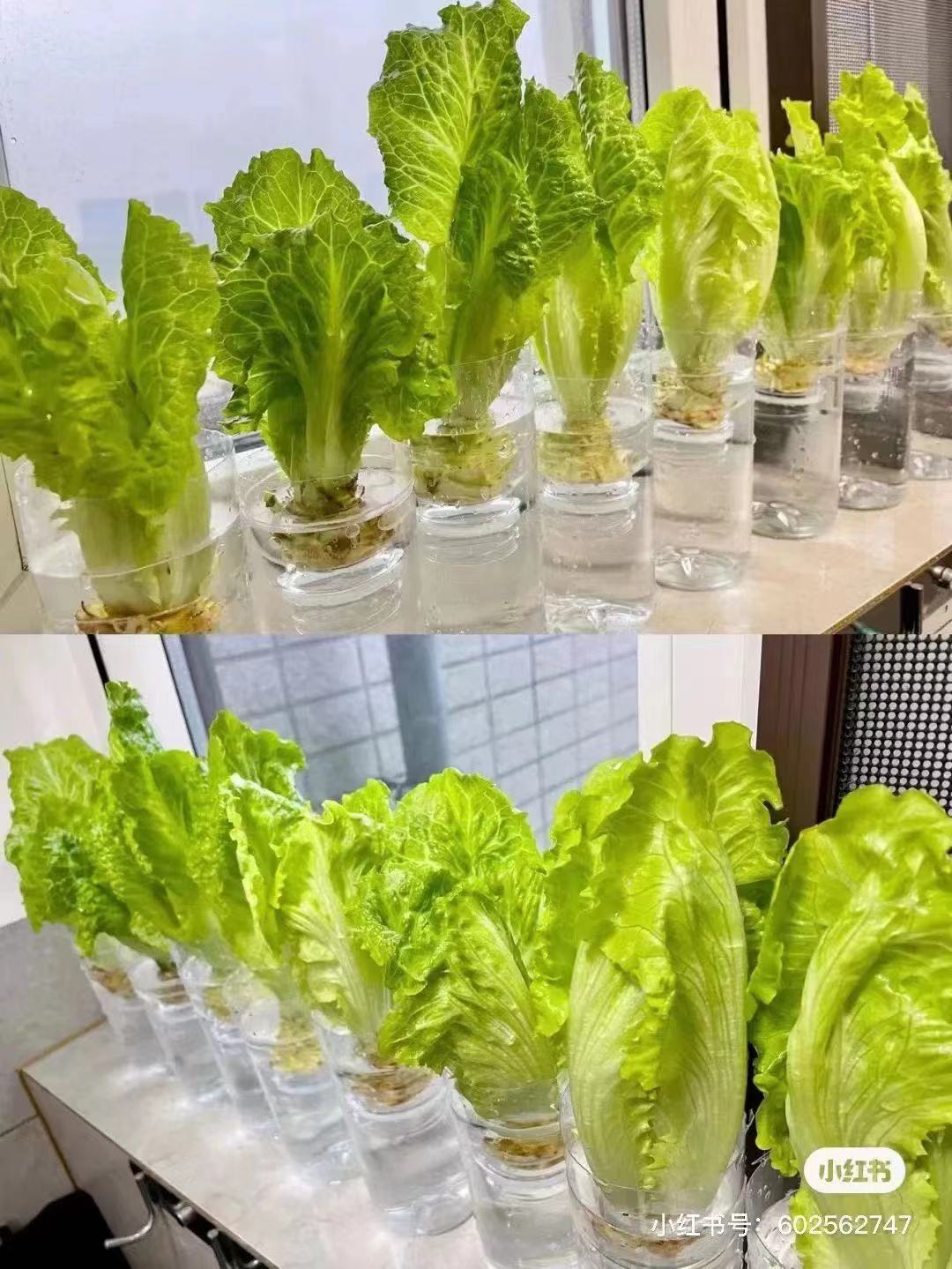 用饮料瓶子或者其他器皿放水,将生菜芯放入水中,只需要根部接触到水即可。