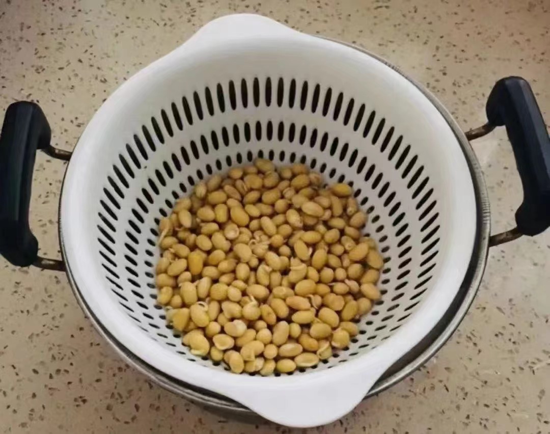 浸泡过后清洗一下豆子,平铺在沥水篮里,下面放一丢丢水,拿一块布盖上;