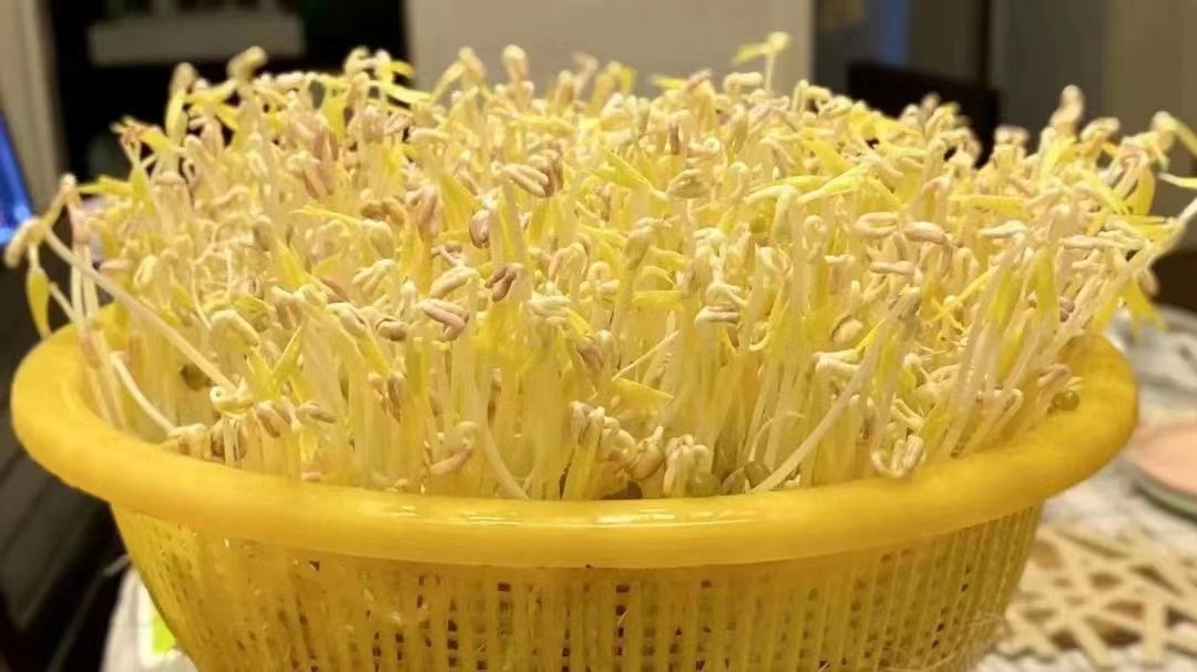 毛巾拿下来(保持毛巾干燥),冲洗豆芽,洗完再盖回去。
