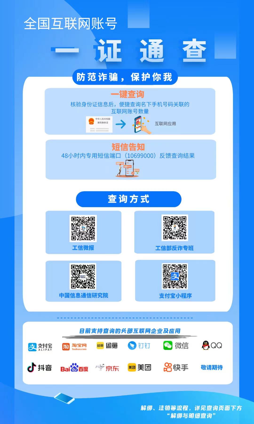 “一证通查2.0”是在工业和信息化部网络安全管理局指导下,由工业和信息化部反诈中心(中国信息通信研究院)在全国移动电话卡“一证通查”服务的基础上,联合互联网企业和电信企业推出的全国互联网账号便民查询服务。