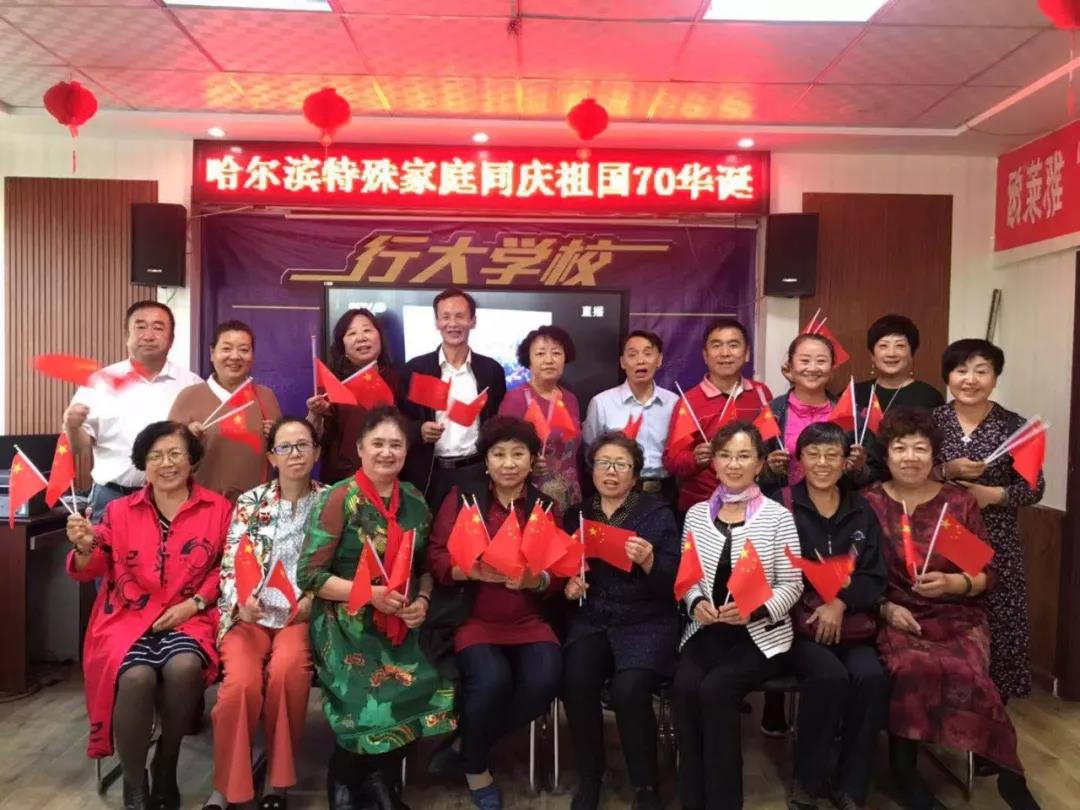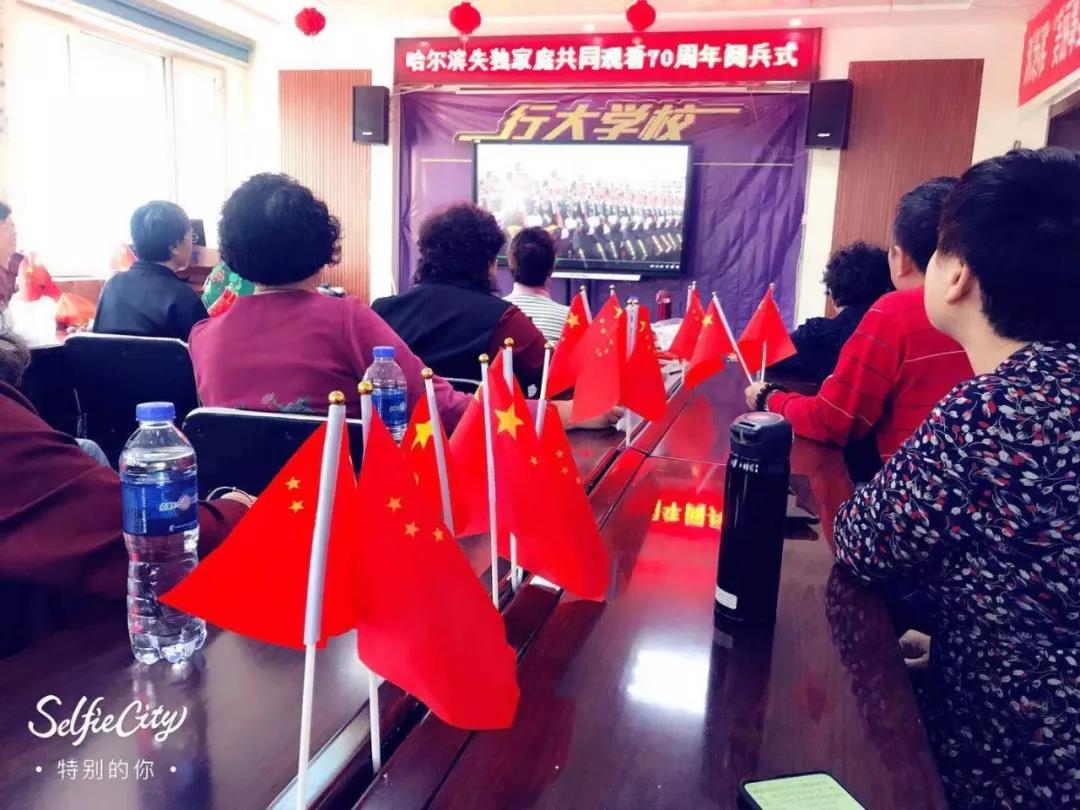 行大公益教职员工、行大学校儿推班学员志愿者及来自哈尔滨25户失独家庭代表齐聚行大,共同观看2019国庆阅兵直播,共同祝愿祖国繁荣富强昌盛,盛世太平人民安康。