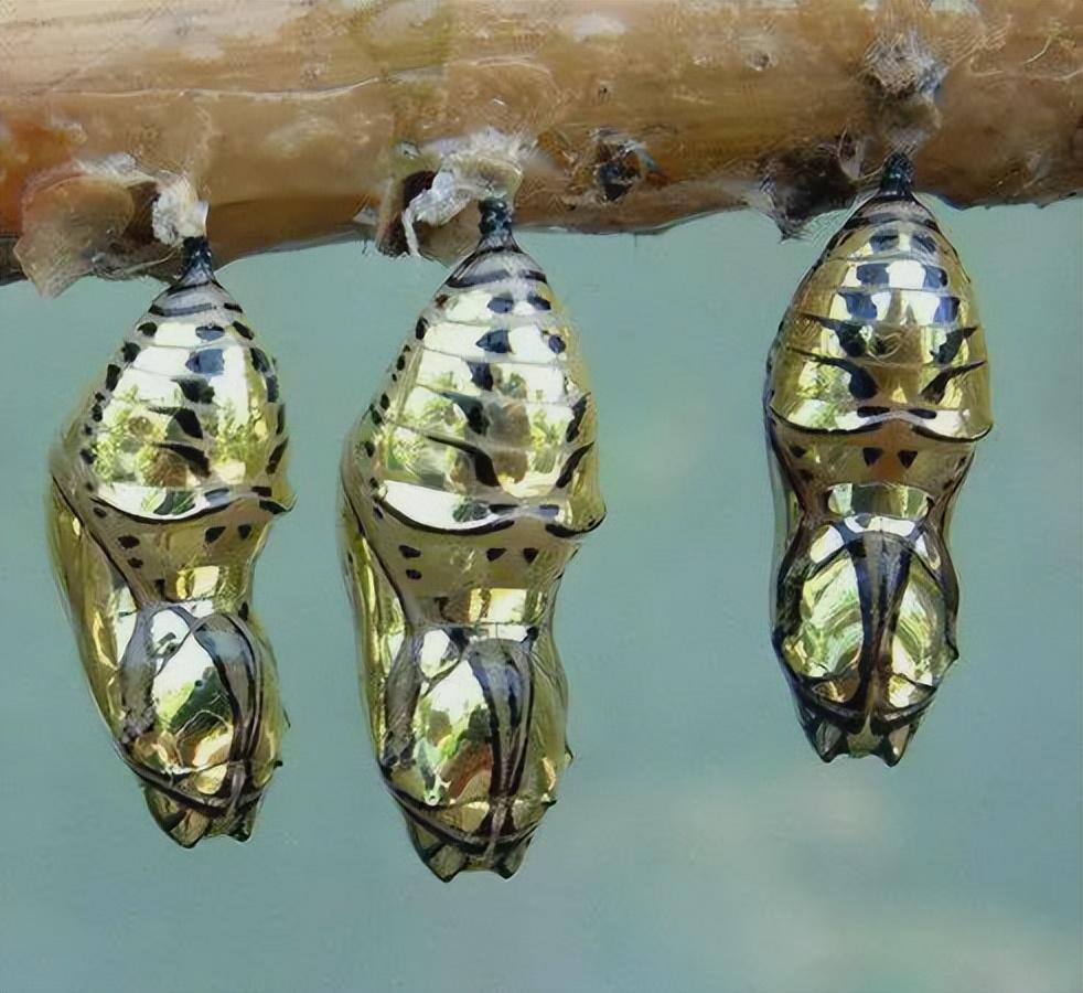 7. 圣歌女神裙绡蝶的蛹名字炫酷,外表仿佛镀了一层璀璨的黄金,闪耀着金属的光辉。
