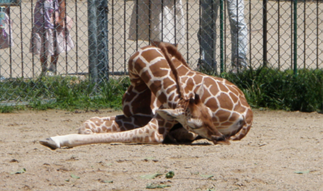 比如说日本爱媛县立砥部动物园的长颈鹿宝宝杏子,它睡觉时就把脖子完全放平,整个身体贴在地上: