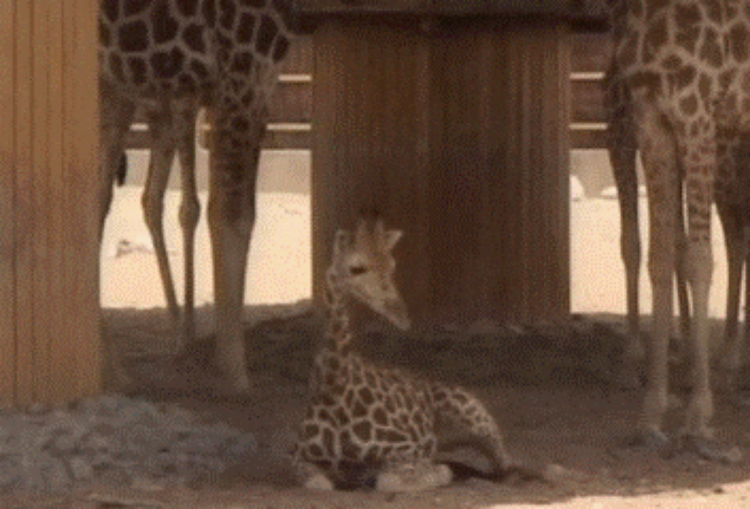 上面说的都是已经成年的长颈鹿,而刚刚出生的小长颈鹿睡觉姿势会更加放飞自我