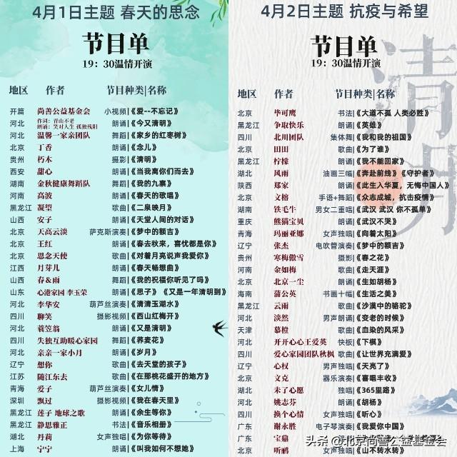 4月1日-2日分别举行了“春天的思念”和“抗疫与希望”两场主题网络文艺活动,有朗诵、歌舞、器乐演奏、书画等70多个丰富的节目。有近百位失独父母参与演出,有人在春寒料峭中穿上夏日的衣裙录制一支舞,有人尽心尽力地为节目反复排练,只为在这个清明给同命人带去一份温暖和鼓励。