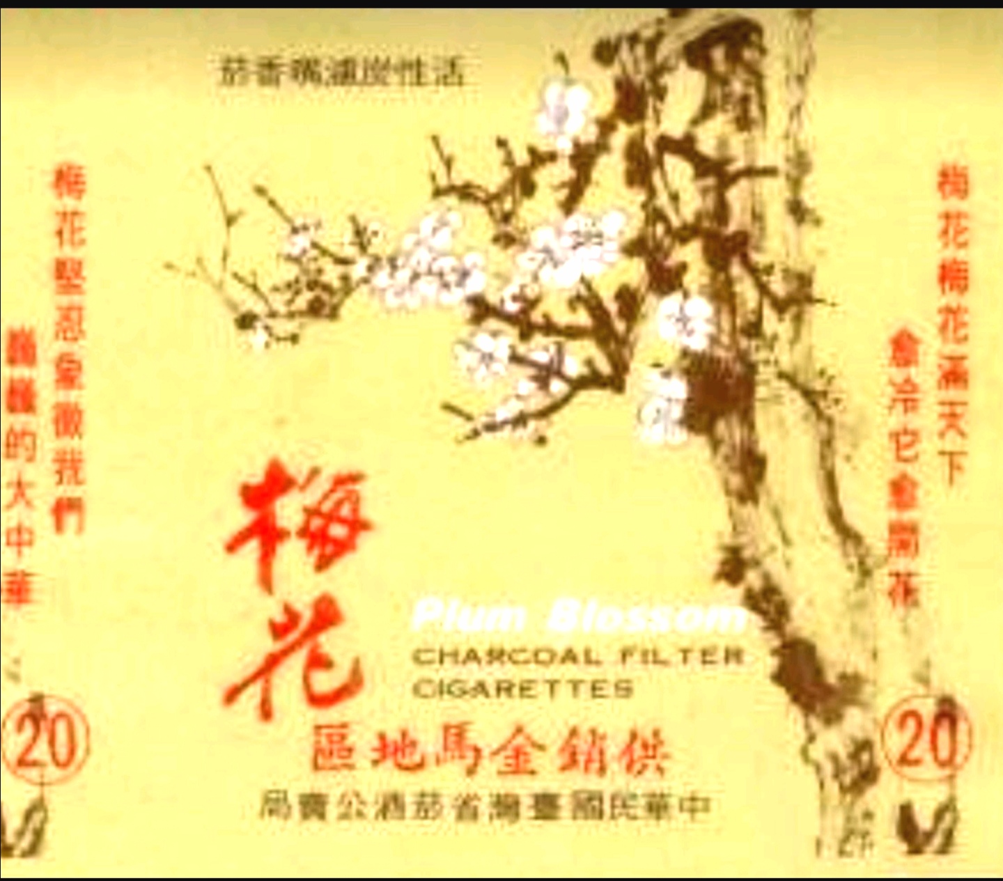 华与花谐音通假,【国华】即国花。”民国政府”设定梅花为国花。蒋氏填词,邓丽君演唱的【梅花】曲,″梅花梅花满天下,愈冷它愈开花,有土地就有它,冰雪风雨都不怕,坚强象征巍巍的大中华……″,此曲曾风糜宝岛台湾。与大陆推崇【红梅】相左,只有台湾短暂出产过【白梅】烟标,且存世甚少,藏家欲求难觅。