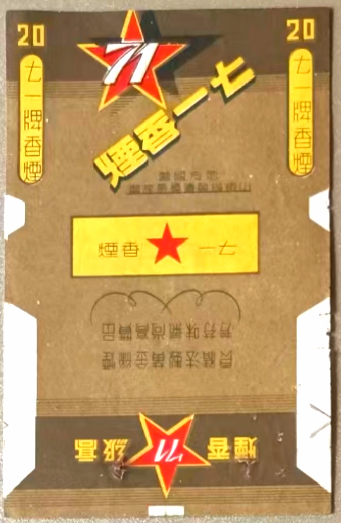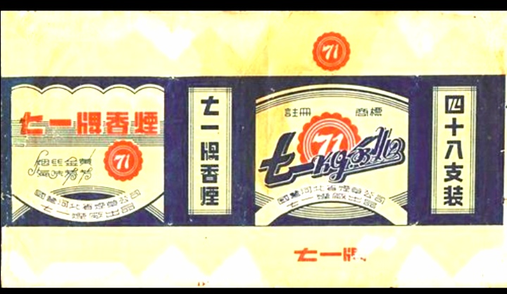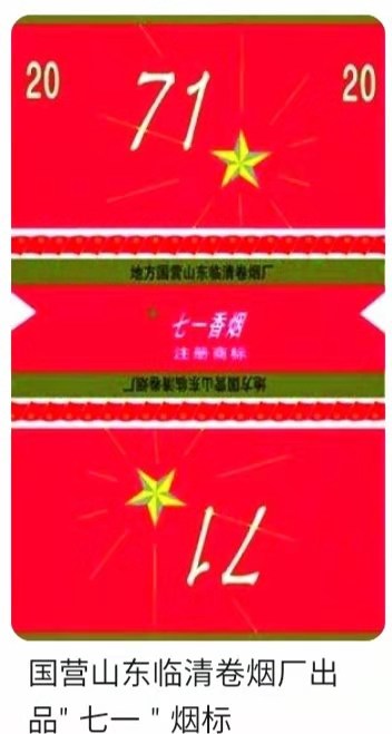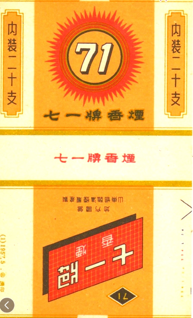为庆祝党中央迁至河北省西柏坡,纪念中国共产党诞生二十七周年,冀南解放区义合烟草公司特制生产了【71】卷烟。 主图中红色的圆形齿轮,寓意中国共产党是中国工人阶级的先锋队,“71”代表中国共产党成立的日期。第一批【71】卷烟共生产 20 箱,由冀南区党委转送党中央,受到中央领导人和军民的欢迎。