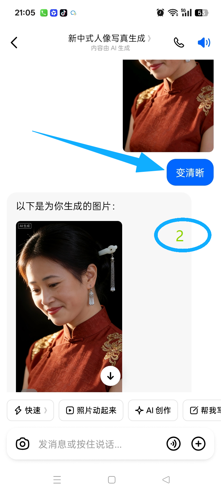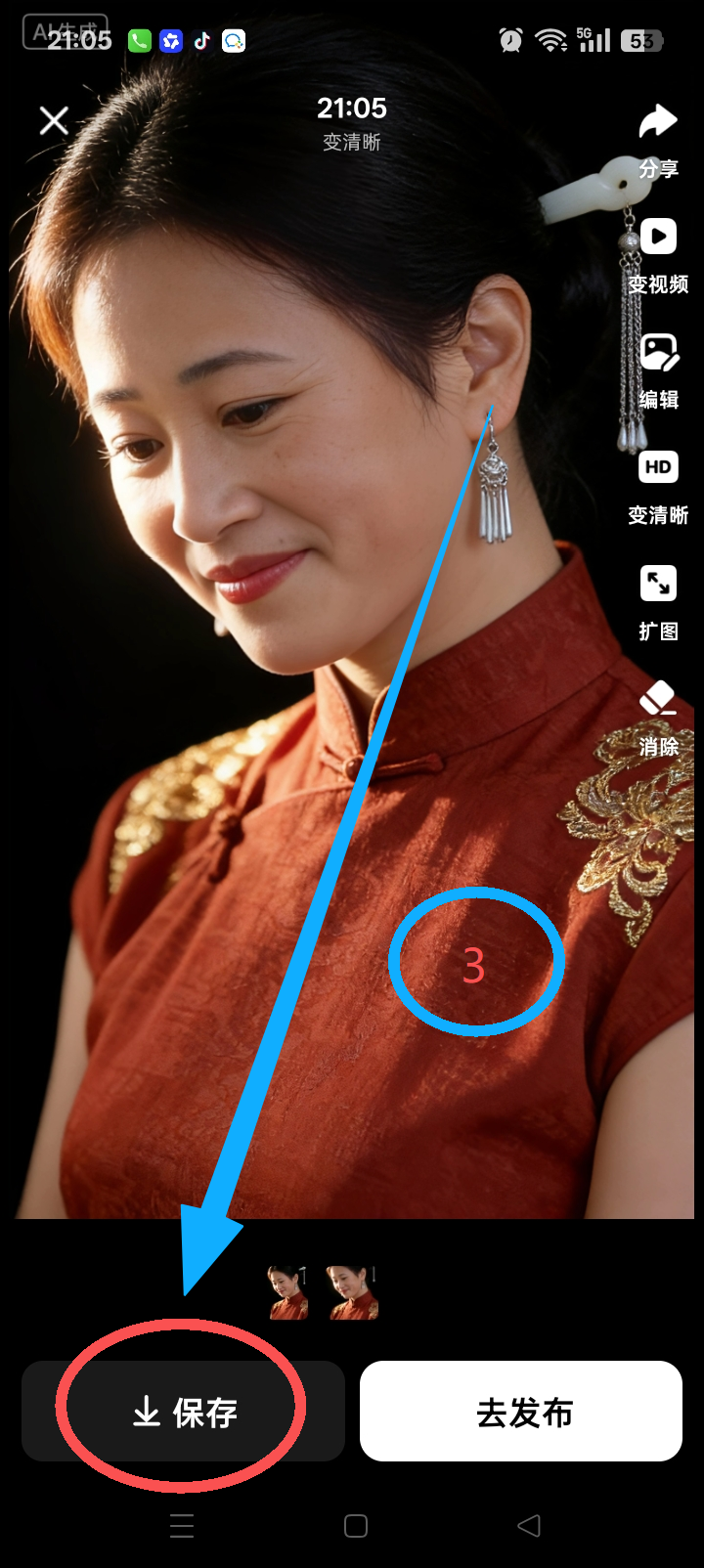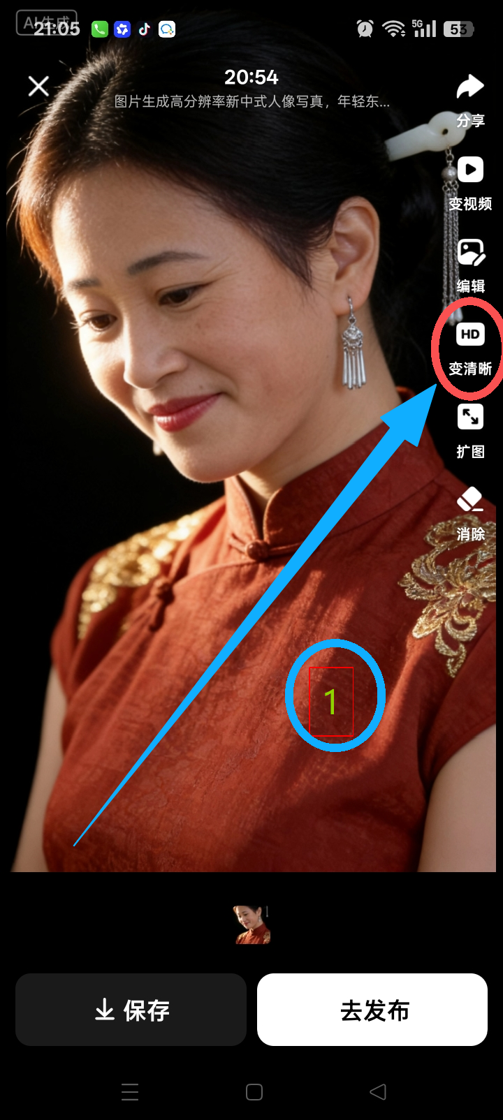 但是我们为了照片更高清更有质感,需要再做最后一步,就是点击照片放大,找到右边工具栏,变高清这个工具点击,大约十秒左右,系统就会生成一幅非常高清质感的写真照片。然后再次点击照片放大,点击左下方的保存,这样这样照片就保存到我们的手机相册库了。