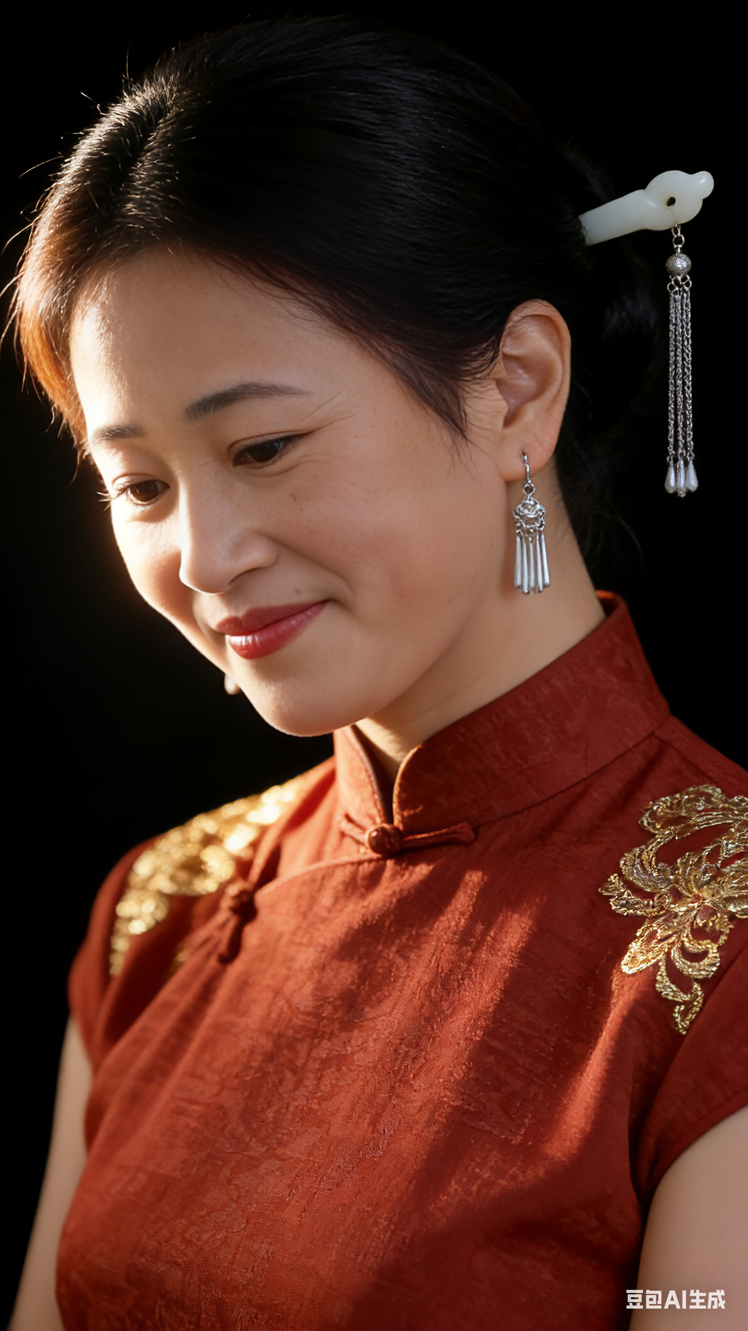 :图片生成高分辨率新中式人像写真,东方女性,温婉低眉浅笑,低盘发配白玉发簪,戴银饰流苏耳坠;身着砖红色暗纹立领旗袍,肩部有精致金色刺绣。纯黑背景, 极简高级。左侧柔和侧逆光勾勒面部与发丝轮廓,形成自然明暗层次,面部补光均匀,肤色通透细腻,保留皮肤真实纹理。整体色调复古温暖,红金配色典雅, 氛围静谧温柔、东方古韵十足。构图为特写肖像, 85mm镜头,f/2.0,胶片颗粒质感,光影层次丰富。图片比例要求为9:16