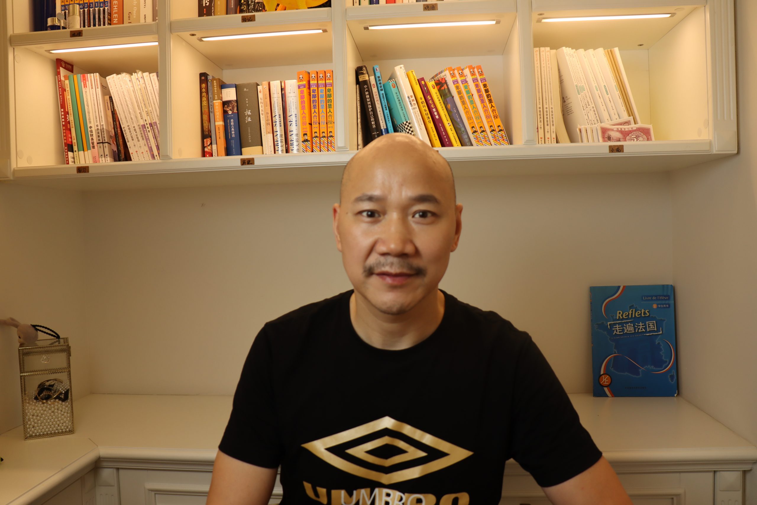 高分辨率现代商务人像写真,东方男性企业家,气质儒雅沉稳,面带谦和微笑,眼神深邃从容。身穿深灰色中山装改良款西装(立领,暗门襟),面料带有暗纹提花,内搭白色衬衫无领带。手持一杯青瓷茶杯,坐在中式现代风格的茶台前,姿态放松而沉稳。背景为私人茶室或书房,有整面书架和悬挂的水墨画,博古架上摆放瓷器与摆件。光线为从窗边竹帘透入的柔和自然光,形成斑驳光影,色调温暖雅致。 氛围内敛深沉,展现东方企业家的文化底蕴与大家风范。构图为半身,85mm镜头,f/2.8,胶片质感,光影层次丰富。比例为9:16。