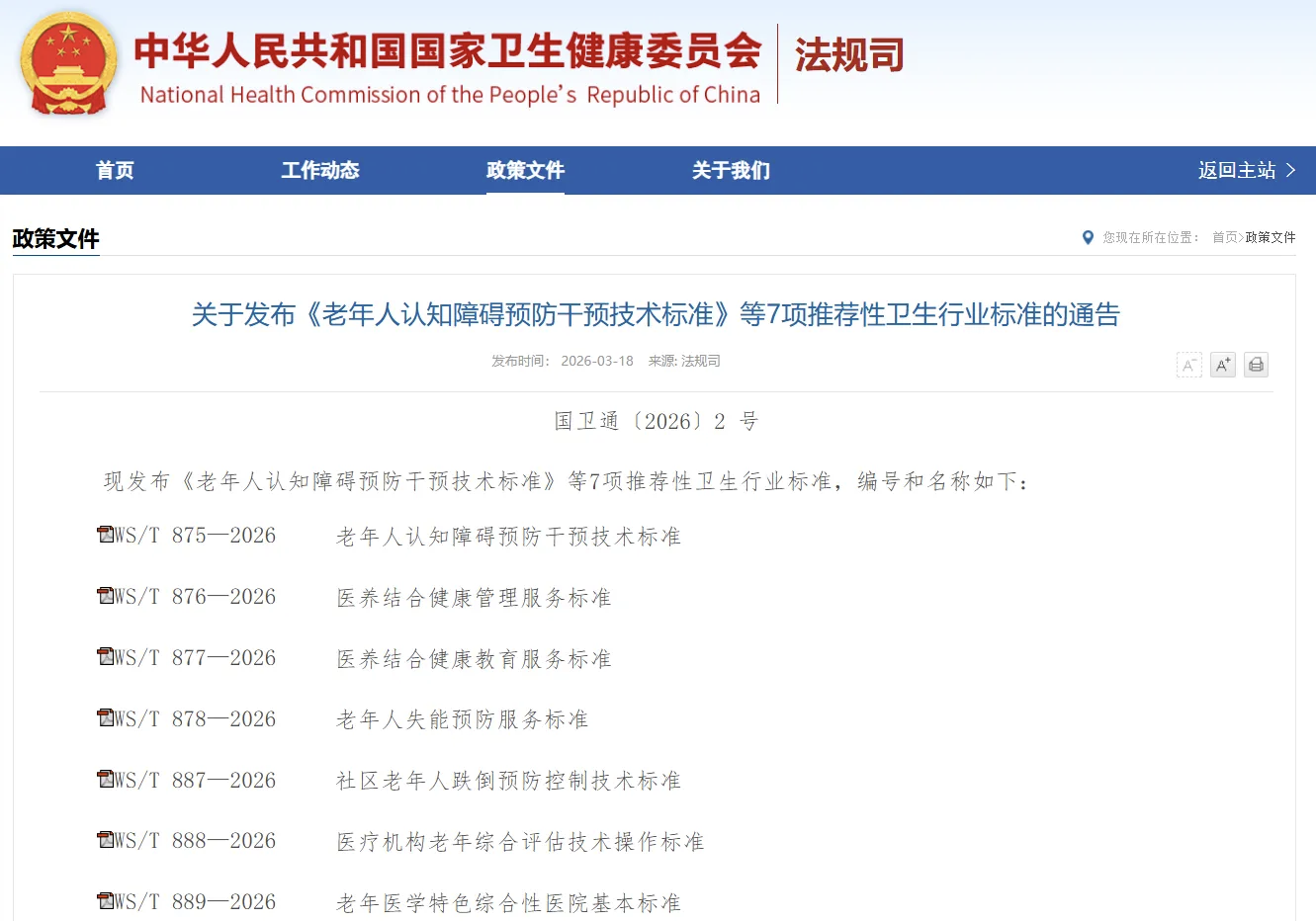 近日,国家卫生健康委发布老龄健康领域7项推荐性卫生行业标准,涵盖老年人认知障碍预防干预、医养结合健康管理、老年人失能预防、社区老年人跌倒预防等多个领域。当前我国人口老龄化进程持续加快,这一系列标准的出台,标志着我国老龄健康服务体系建设在“精耕细作”方面迈出关键一步。