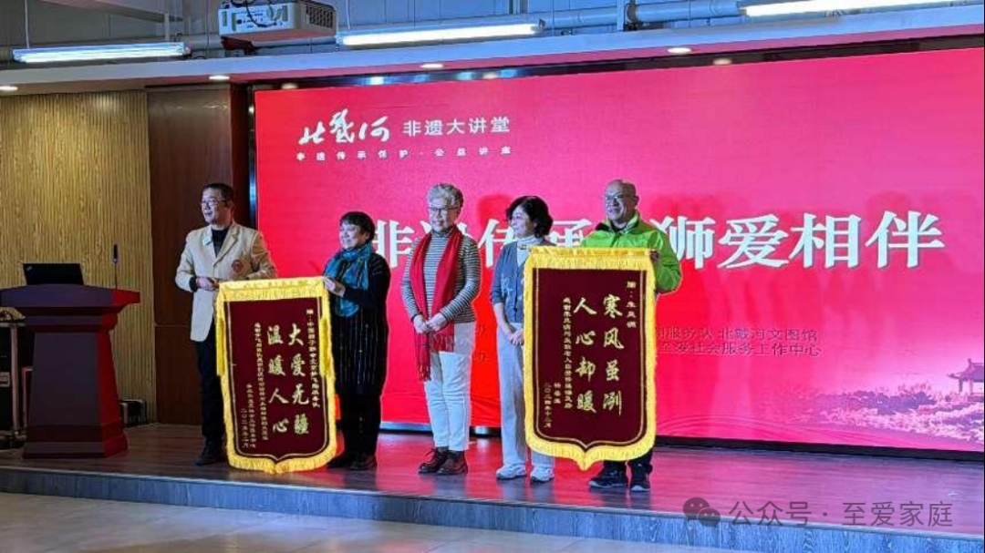 欢迎仪式上梦飞翔服务队的高志队长致欢迎词,北戴河文化图书馆长讲话后,秦皇岛至爱社会工作服务中心的田大华主任替残疾、独居、靠低保收入维持生活的失独母亲杨春荣大姐,为梦飞翔服务队的志愿者朱凤满赠送了锦旗,感谢朱凤满个人出资为她住的下房做了全屋的保暖,让她在这个冬天不在畏惧寒冷,不用在屋里穿着羽绒服过冬了。至爱社会服务中心也为梦飞翔团队赠送了锦旗,感谢梦飞翔服务队的志愿者们一年多来对失独群体的关心、陪伴,感恩他们用青春和热血践行者“奉献、友爱、互助、进步”的志愿精神。