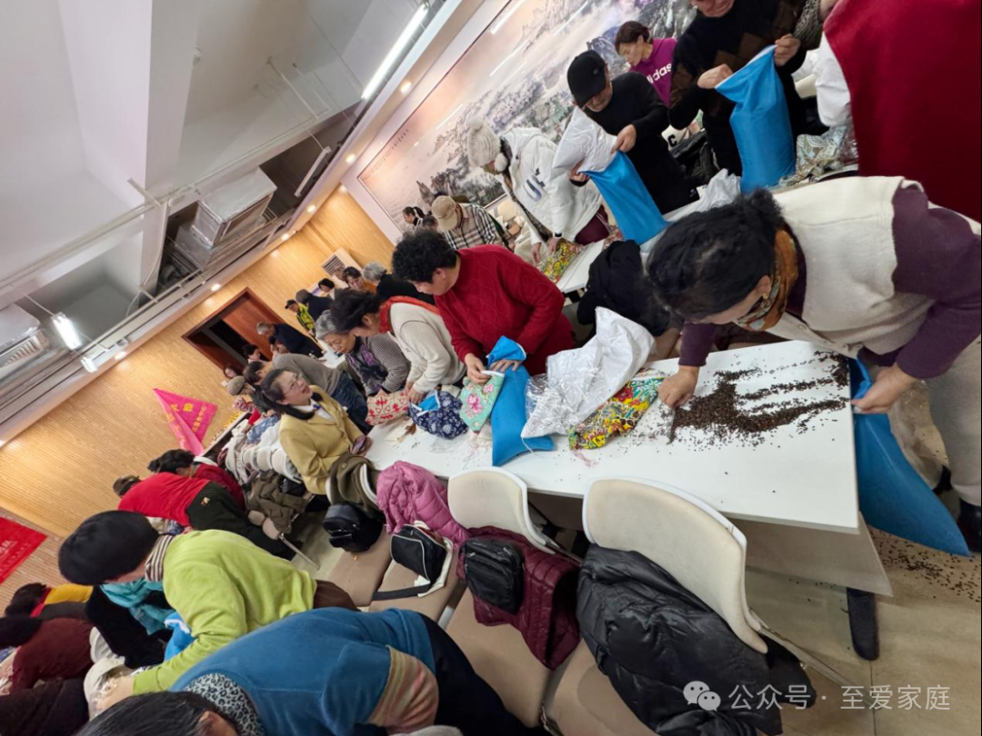 活动中,至爱家人们亲手制作梦飞翔服务队准备的荞麦虎型睡枕。在专业老师的指导下,大家将荞麦装入布袋,又把志愿者准备了玫瑰花瓣一起装入,带着芬芳的睡枕经大家的一番忙碌就制作成功了。这项手工制作不仅让大家体验到传统手工艺的乐趣,还能将自己亲手制作的寓意吉祥、香气四溢的睡枕,带回家中作为纪念。至爱服务中心也为这次活动带来了北京尚善公益基金会为家人们制作的布艺包,包上的“向光而行”四个大字即温馨又鼓舞。
