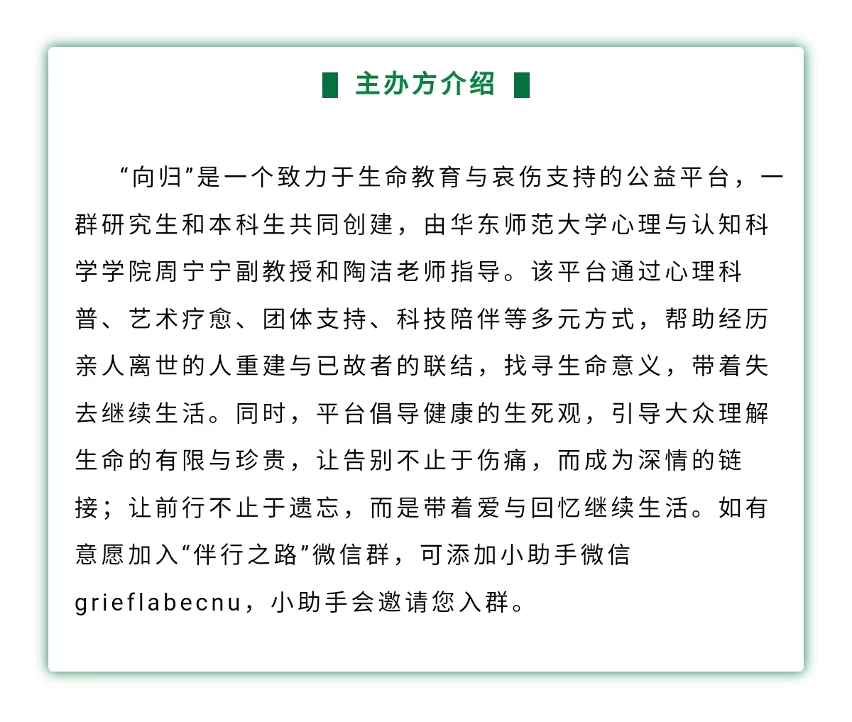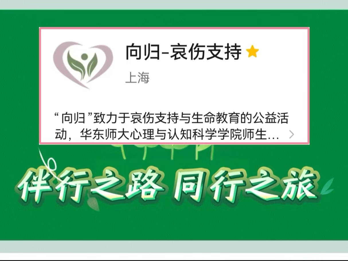“向归”是一个致力于生命教育与哀伤支持的公益平台,一群研究生和本科生共同创建,由华东师范大学心理与认知科学学院周宁宁副教授和陶洁老师指导。