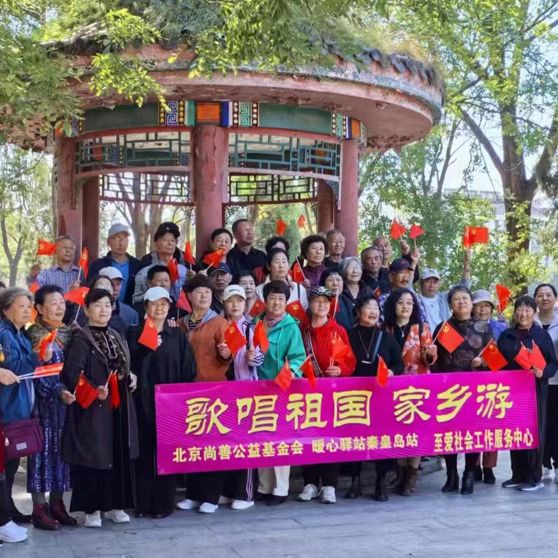 活动现场在古色古香的凉亭下,46位失独父母齐聚一堂,他们手中紧握着象征和平与希望的五星红旗,脸上洋溢着激动与期待的表情,共同期待着国庆佳节的到来。