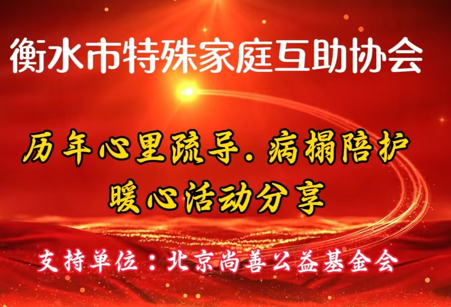 〔衡水特殊家庭互助关爱协会]难忘初心,用真情,几经风风雨雨,坎坎坷坷,以互助搀扶理念,公益活动为主题,九年中举办近几百场暖心活动,近几千人次的健身,健心舒缓活动,病榻陪护帮扶服务几百人次,用行动释怀爱的真谛,令同命兄弟姐妹们凝心聚力,逆风飞翔,含泪奔跑。未来路还很长,更需要全社会给与这些孤寡、失独老人的晚年生存,解决他们后顾之忧!!!