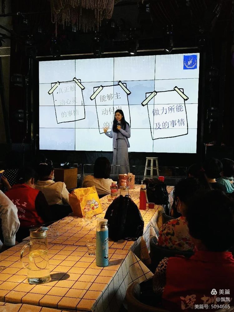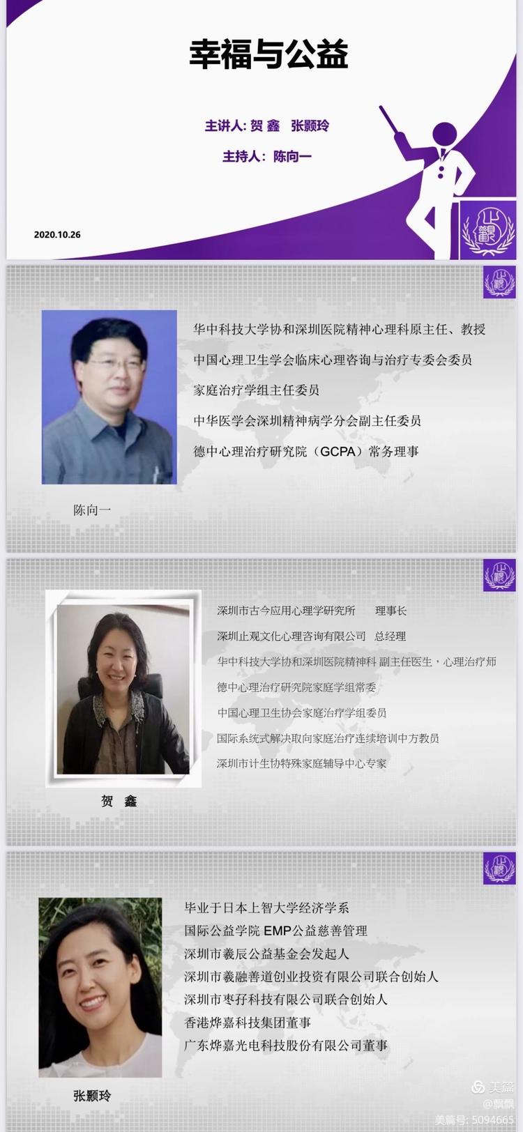 上午10:00–12:00《幸福与公益》为讲座时间:“幸福”由贺鑫老师主讲、“公益”由张颢玲老师主讲、“讨论&分享”部分由陈向一老师主持,“让改变即刻发生: