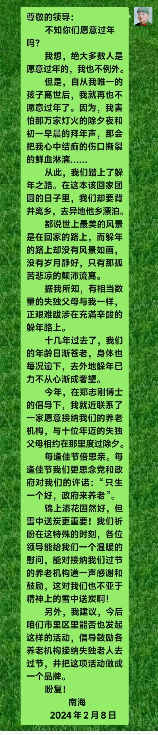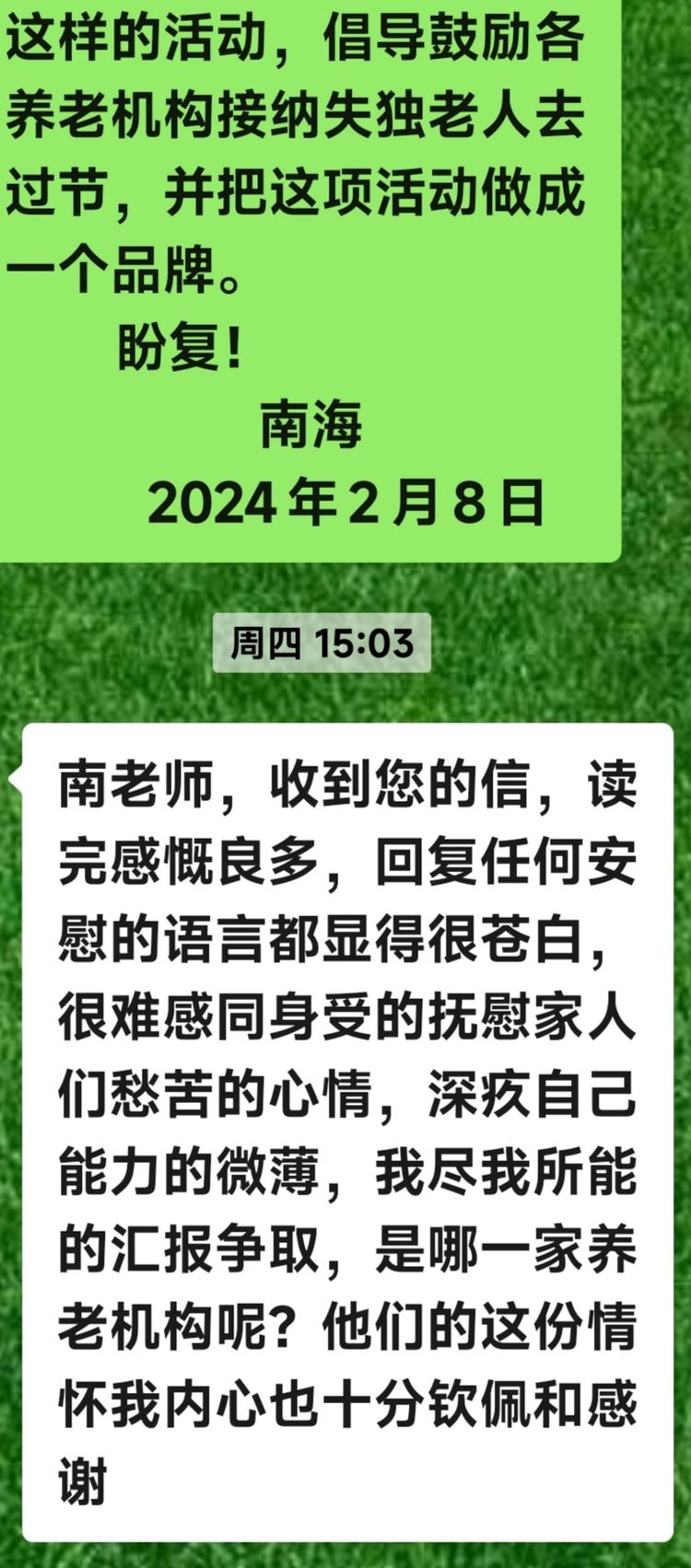人员确定之后,我给市、区两级卫健部门和计生协会的相关负责同志写了一封信,建议在除夕那天能到场给予慰问,向养老机构表达支持、感谢之情,这对我们也是精神慰藉方面的雪中送炭。