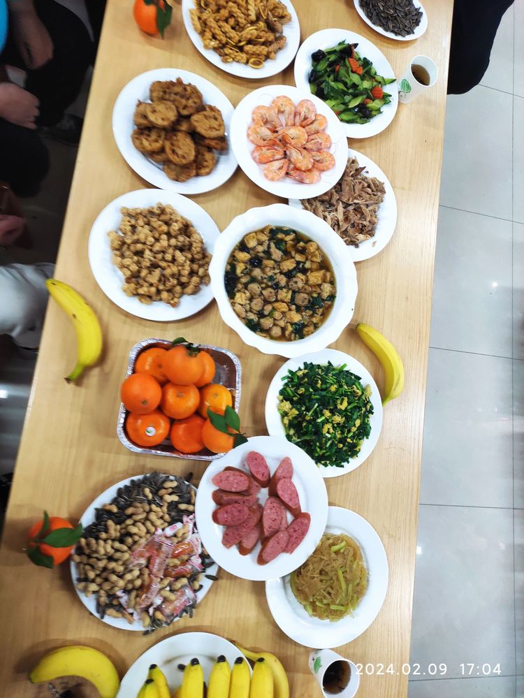 大家把各自带来的亲手制作的菜品食品也摆上桌。