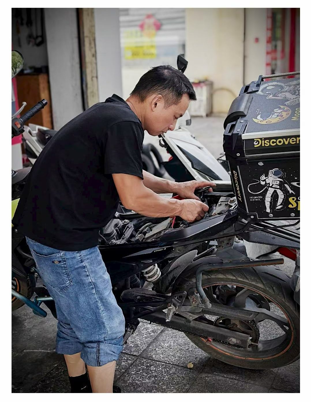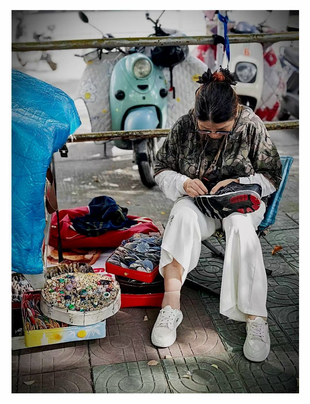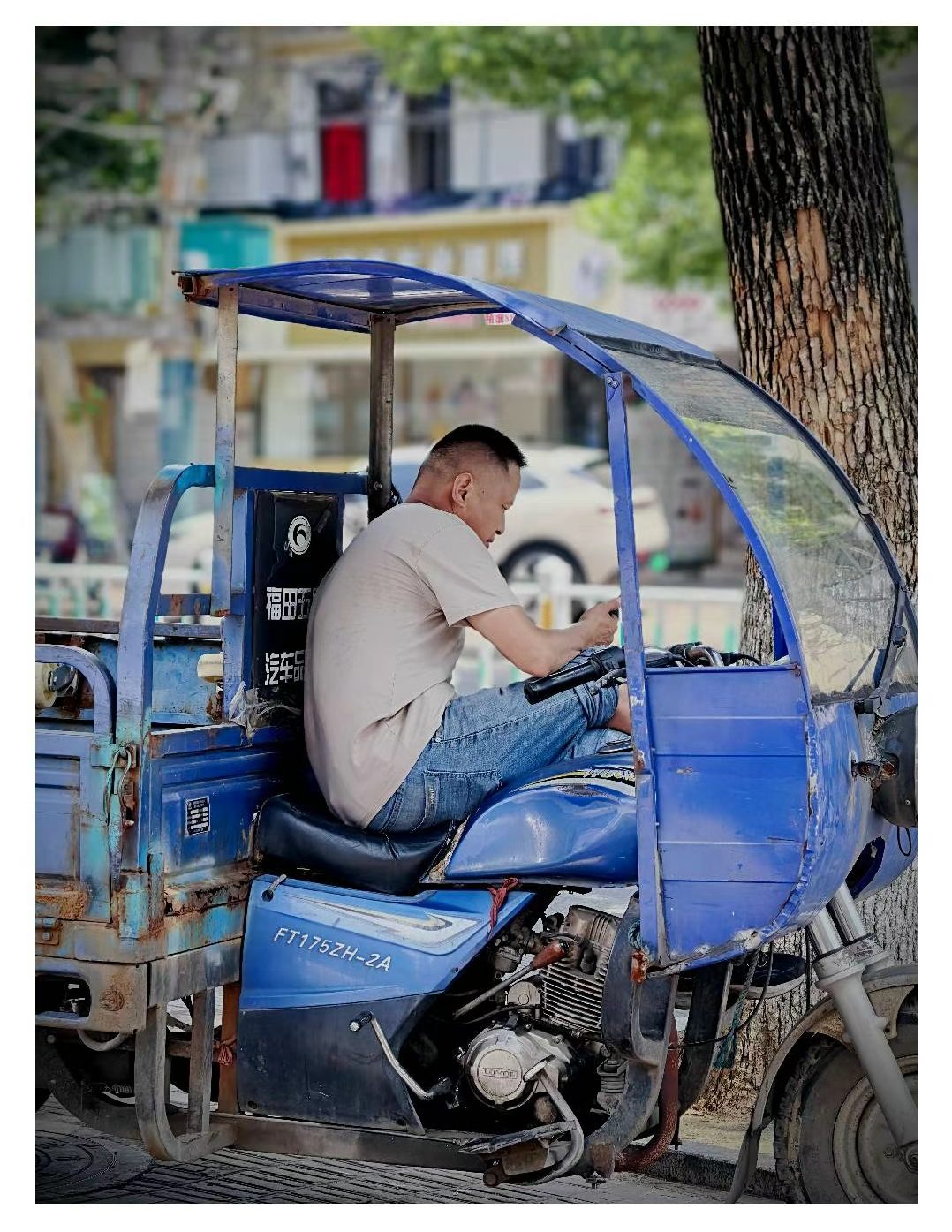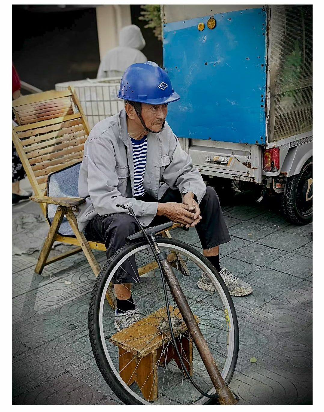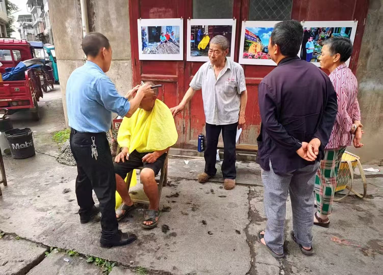 街头,修车师傅守着摊位,用手艺为路人解决难题,在热浪里撑起一方便民小天地;