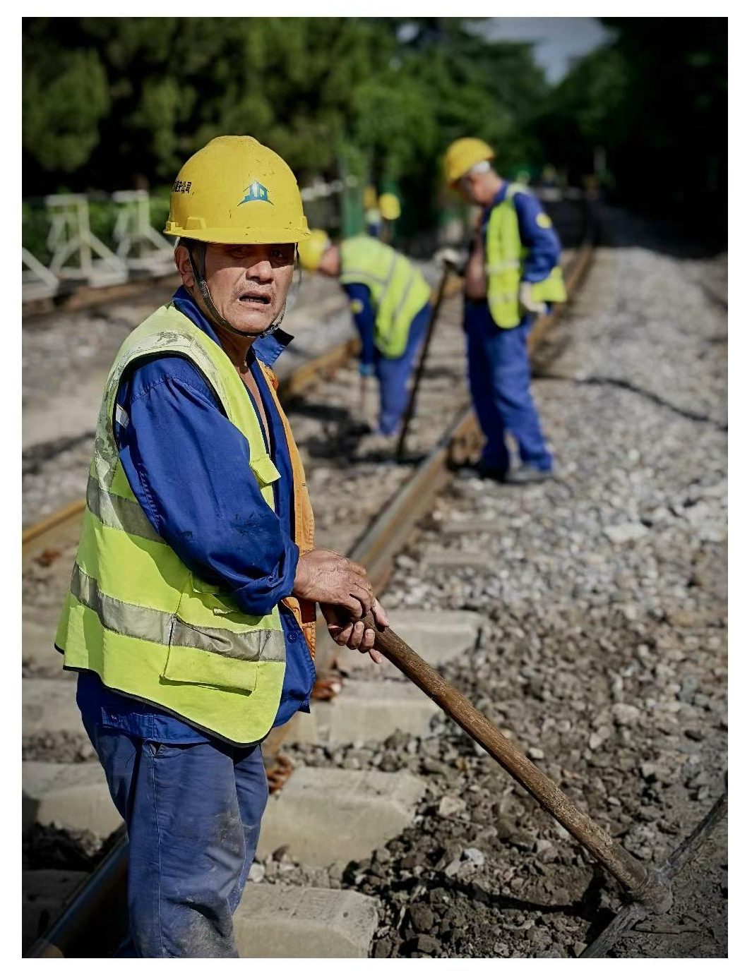 铁路轨道旁,工人们着装整齐,在滚烫的铁轨边忙碌。铁镐铁锹扬起又落下,汗水顺着脸颊滚落,浸湿衣衫,只为了职责的坚守和保障铁路运行安全 ;
