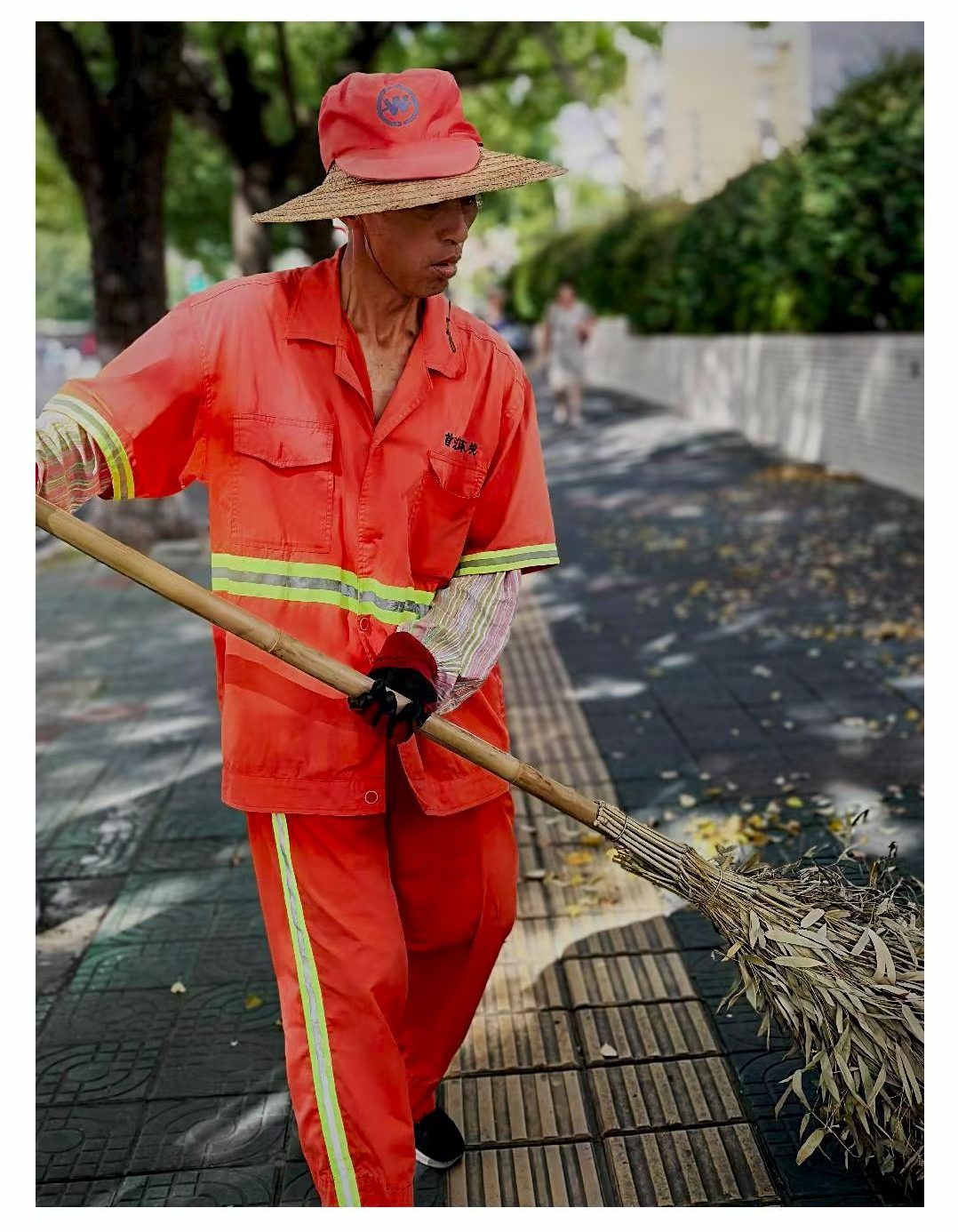 环卫工人身着橘色工装和草帽,清扫着高温发烫的路面,衣衫干了又湿,却默默扮靓城市,成为街头最美的风景;