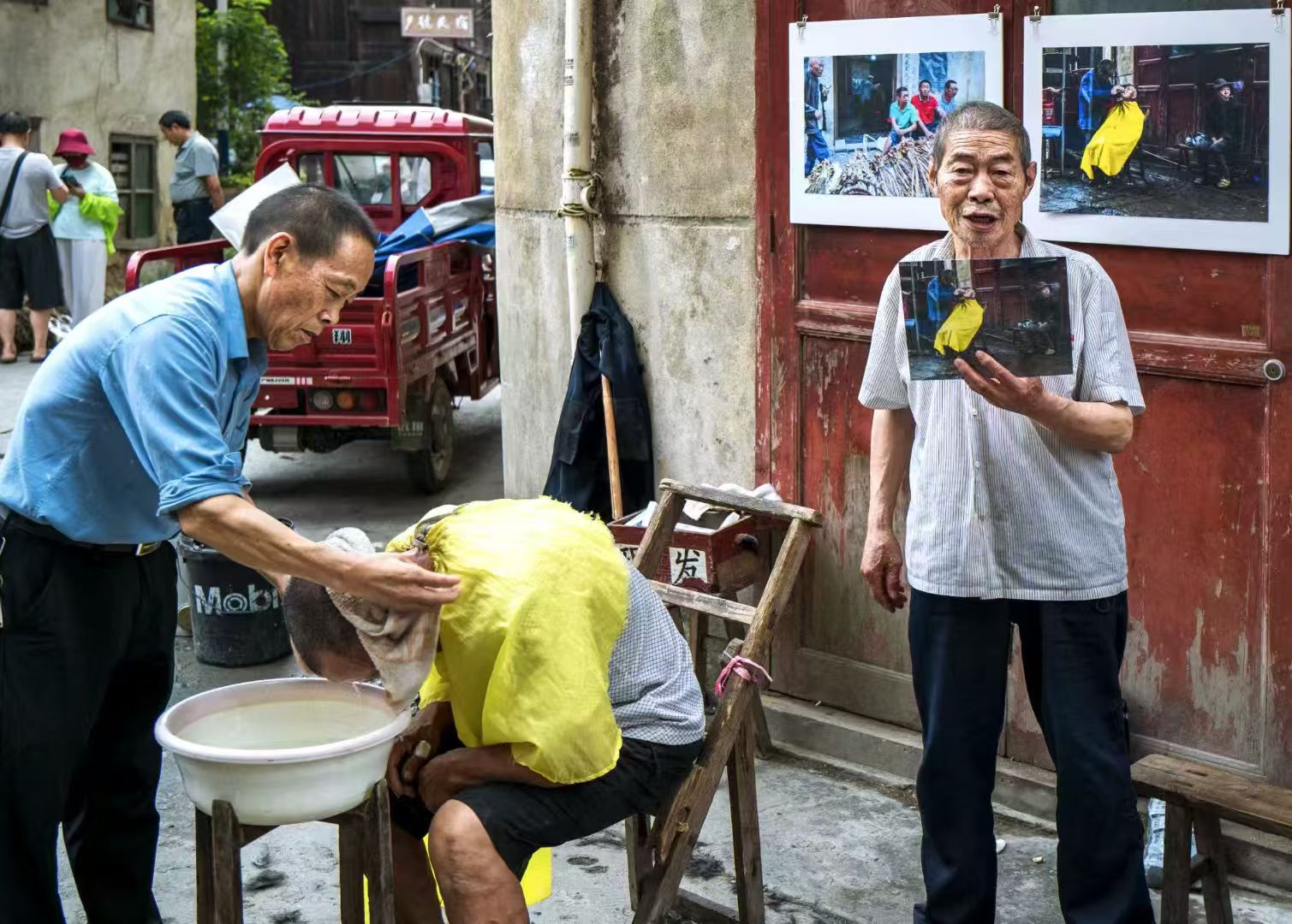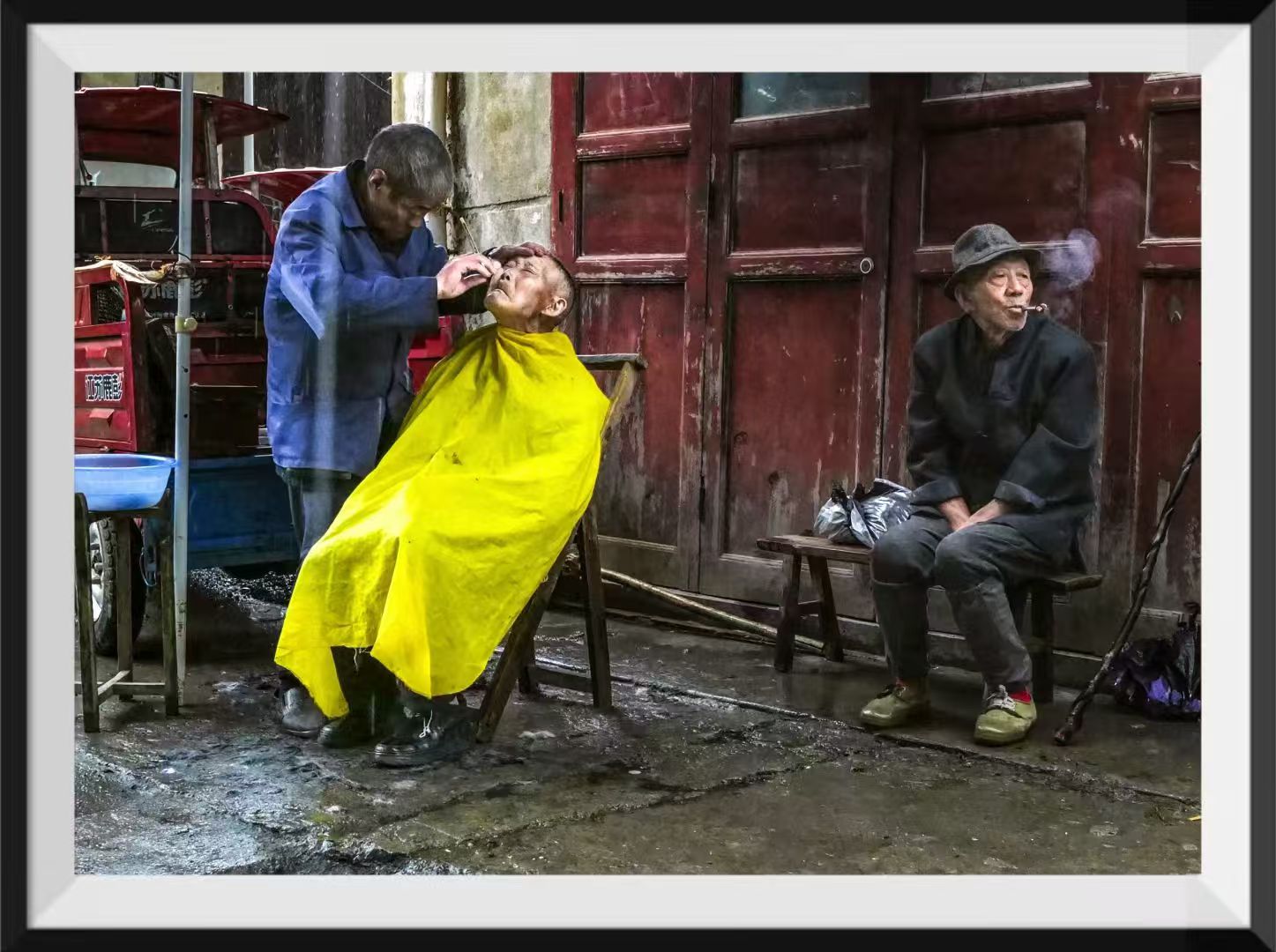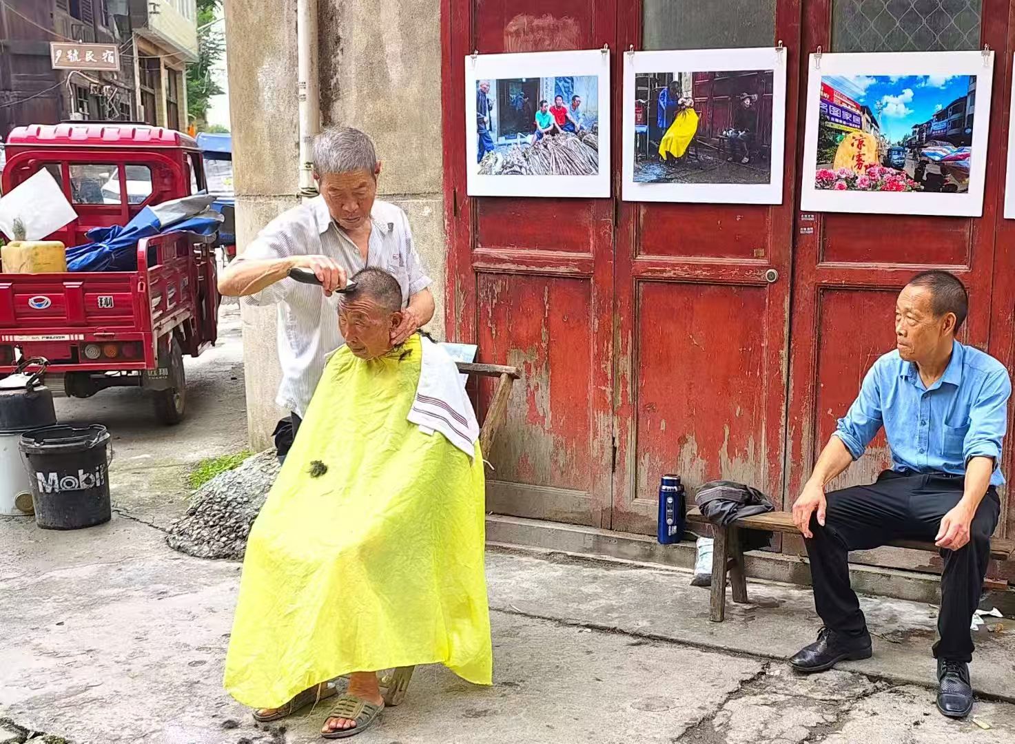 去年7月的一个阴雨天,在凉雾老街拍了一张街头理发师照片,获得丽水首届全国街头摄影展入选参展。今年带着这张照片回到凉雾,找了这个理发师爹爹几次没遇见人,今天赶集他来了,并带来一个徒弟据说是他的亲老表,原来爹爹今年78岁了感觉体力不支,让徒弟熟悉客户以后接着干。我挂上去年那张大照片并赠送他10寸小照片一张,再次为他在劳作多年的摊位前留影纪念,希望明年再遇见他身体健康在为乡民理发。