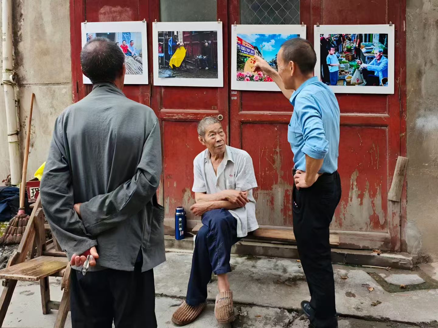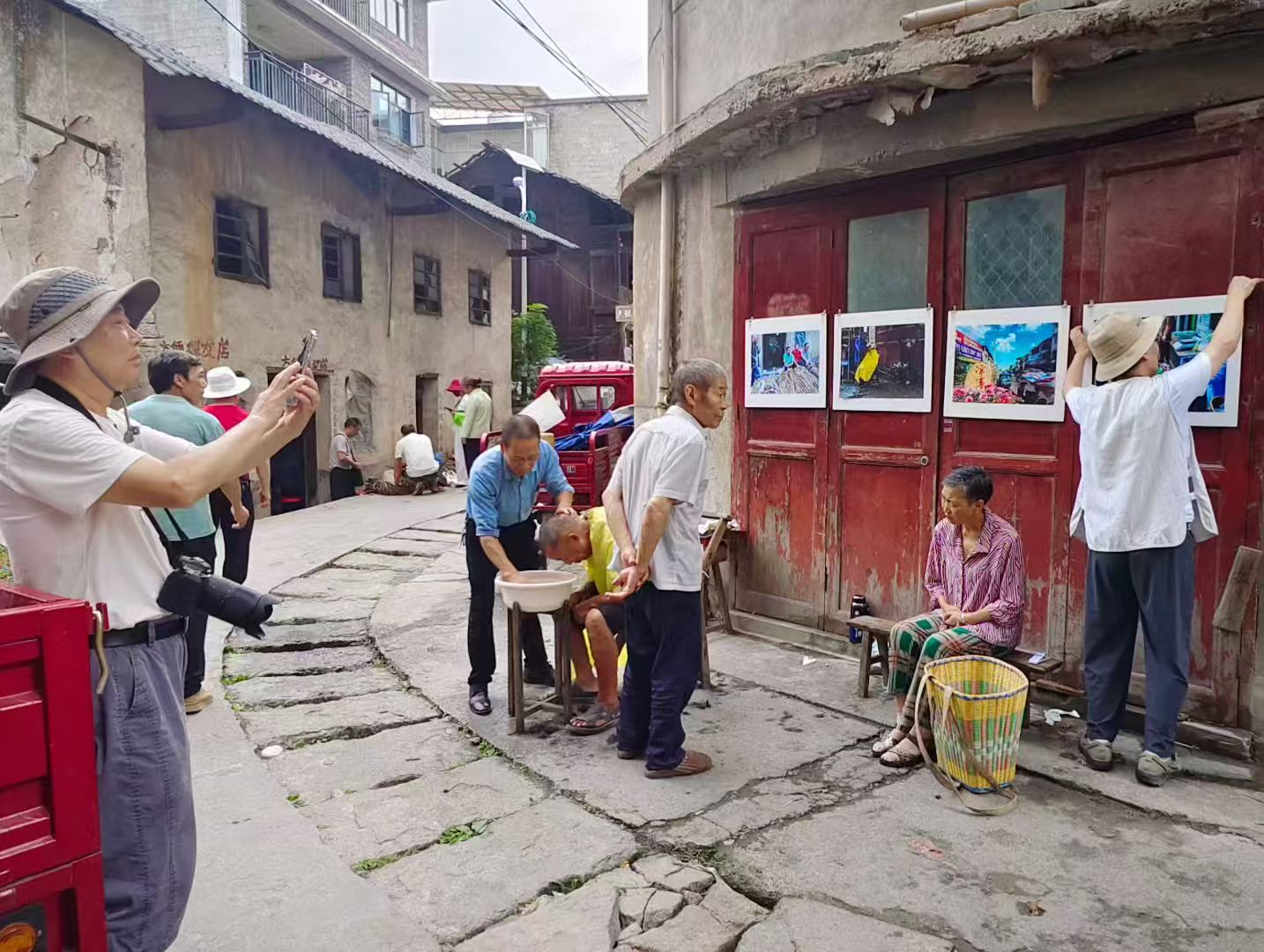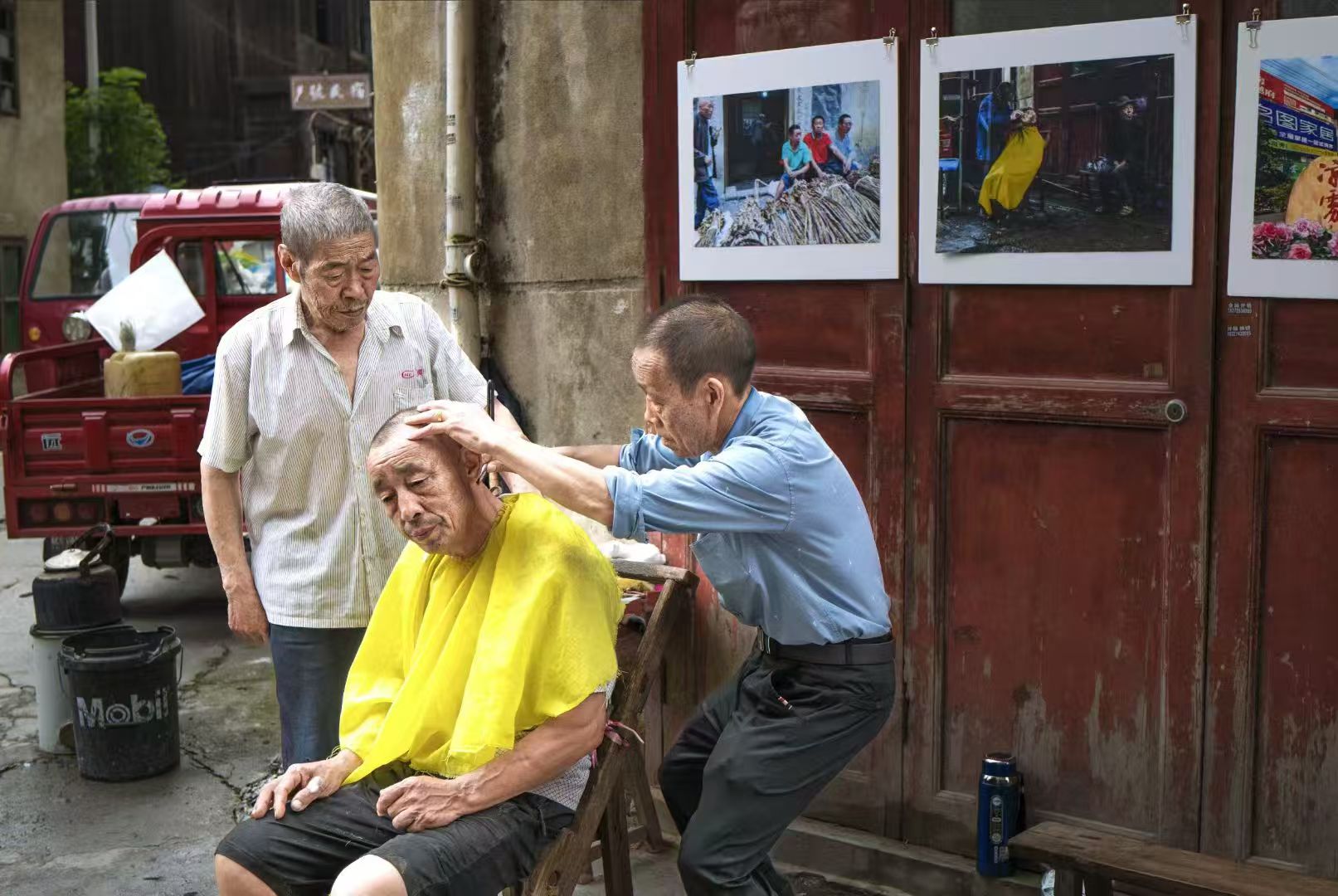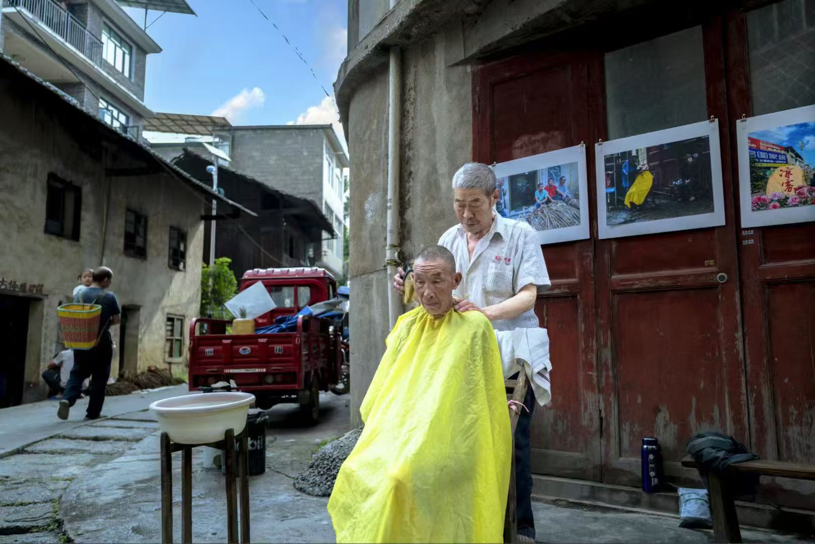 去年7月的一个阴雨天,在凉雾老街拍了一张街头理发师照片,获得丽水首届全国街头摄影展入选参展。今年带着这张照片回到凉雾,找了这个理发师爹爹几次没遇见人,今天赶集他来了,并带来一个徒弟据说是他的亲老表,原来爹爹今年78岁了感觉体力不支,让徒弟熟悉客户以后接着干。我挂上去年那张大照片并赠送他10寸小照片一张,再次为他在劳作多年的摊位前留影纪念,希望明年再遇见他身体健康在为乡民理发。