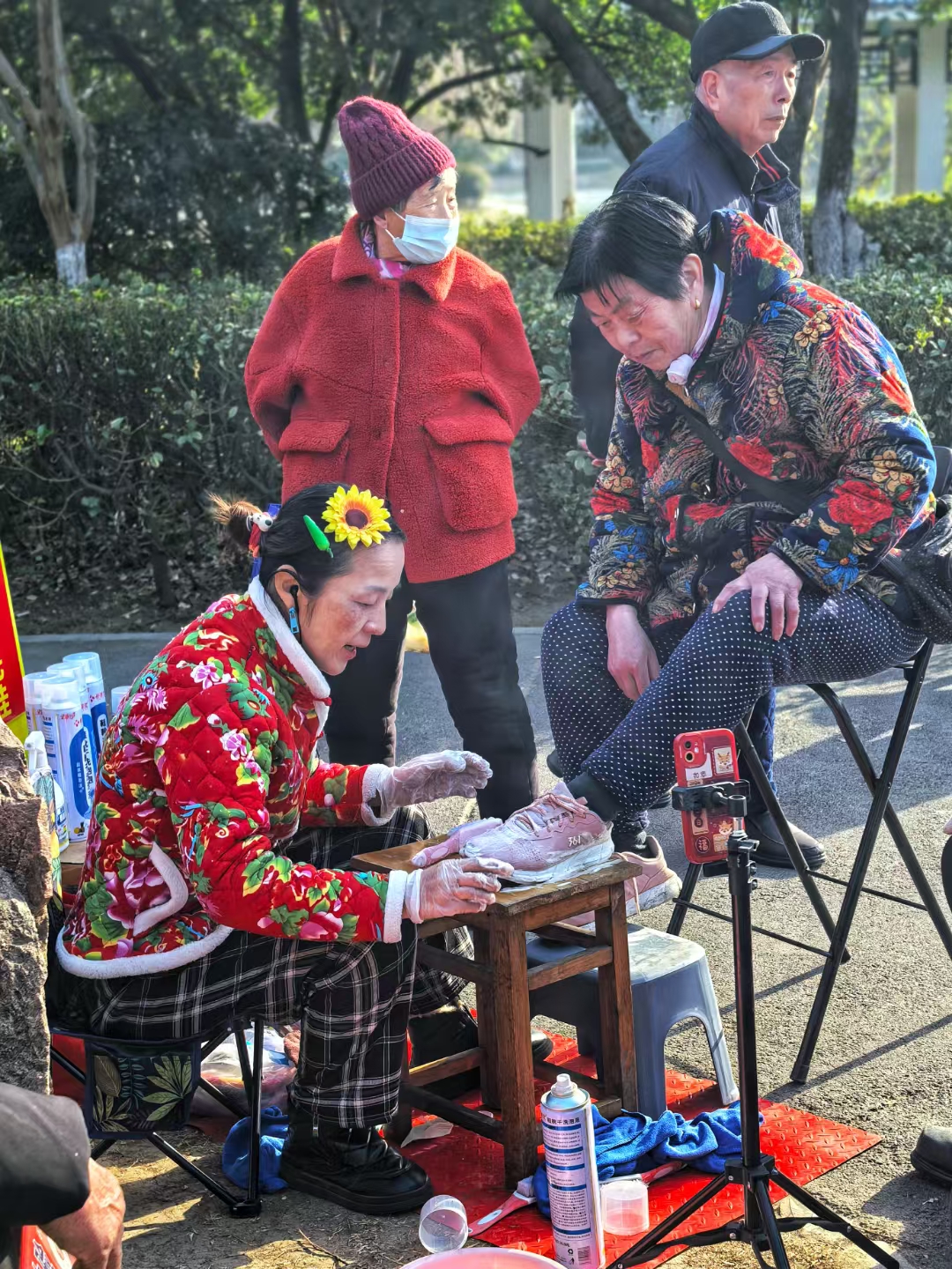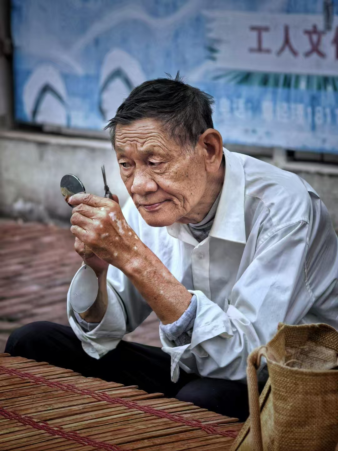 在岁月的光影里,他静静坐着,手中的小镜与工具,似是打开往昔的钥匙。斑驳的双手,刻满生活的痕迹,那专注的眼神,藏着对美好生活的憧憬。