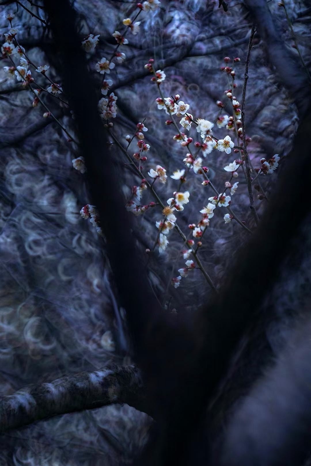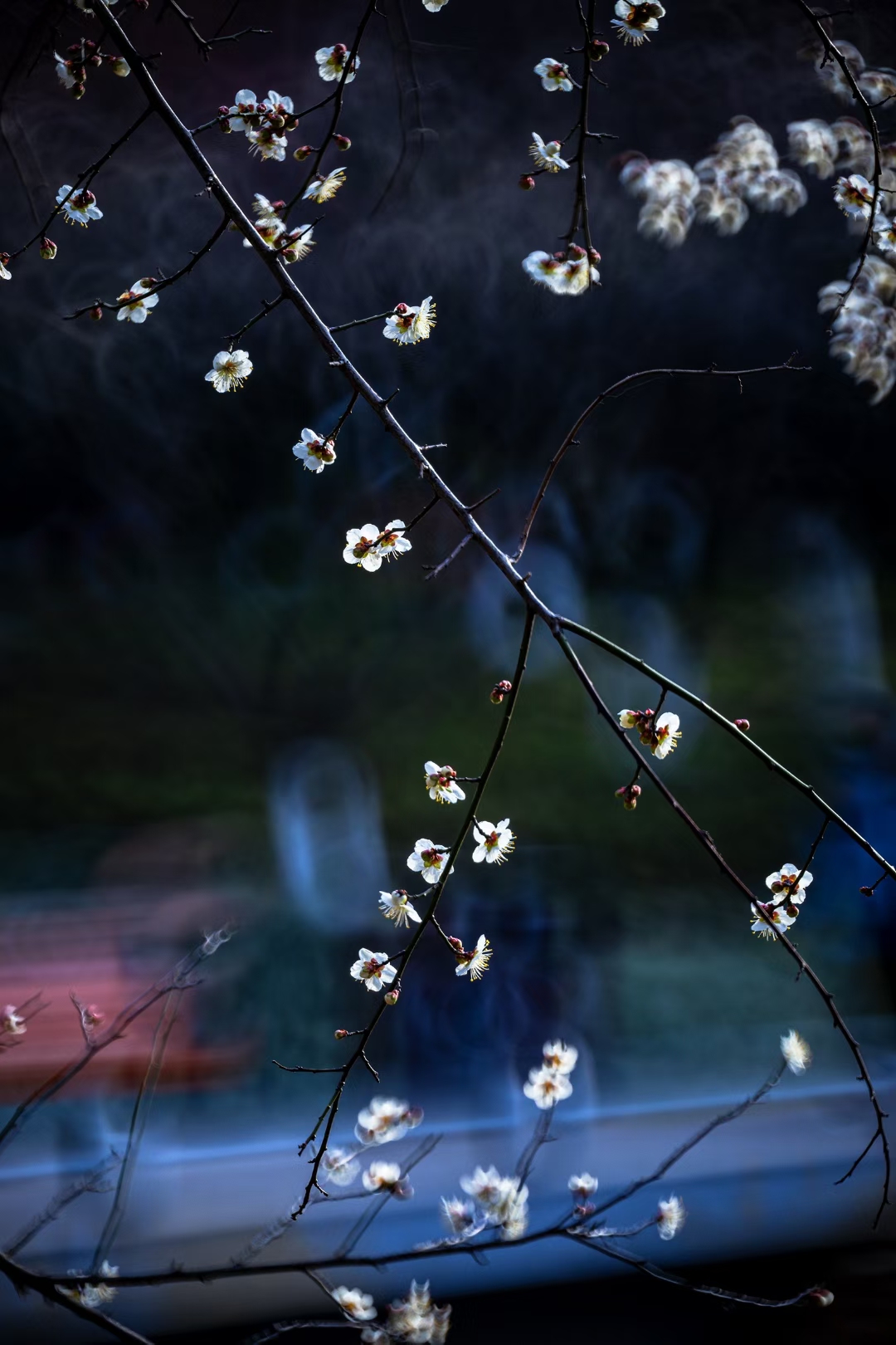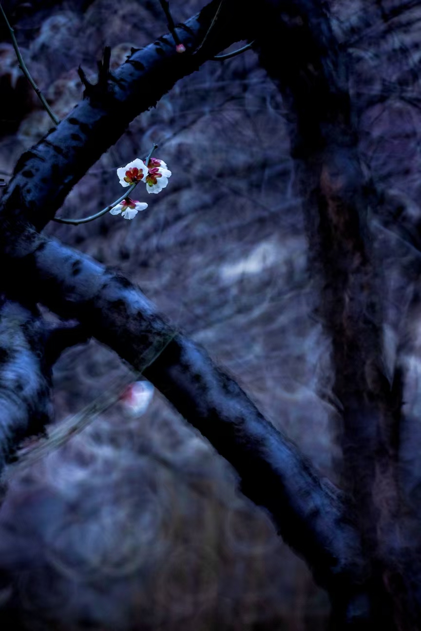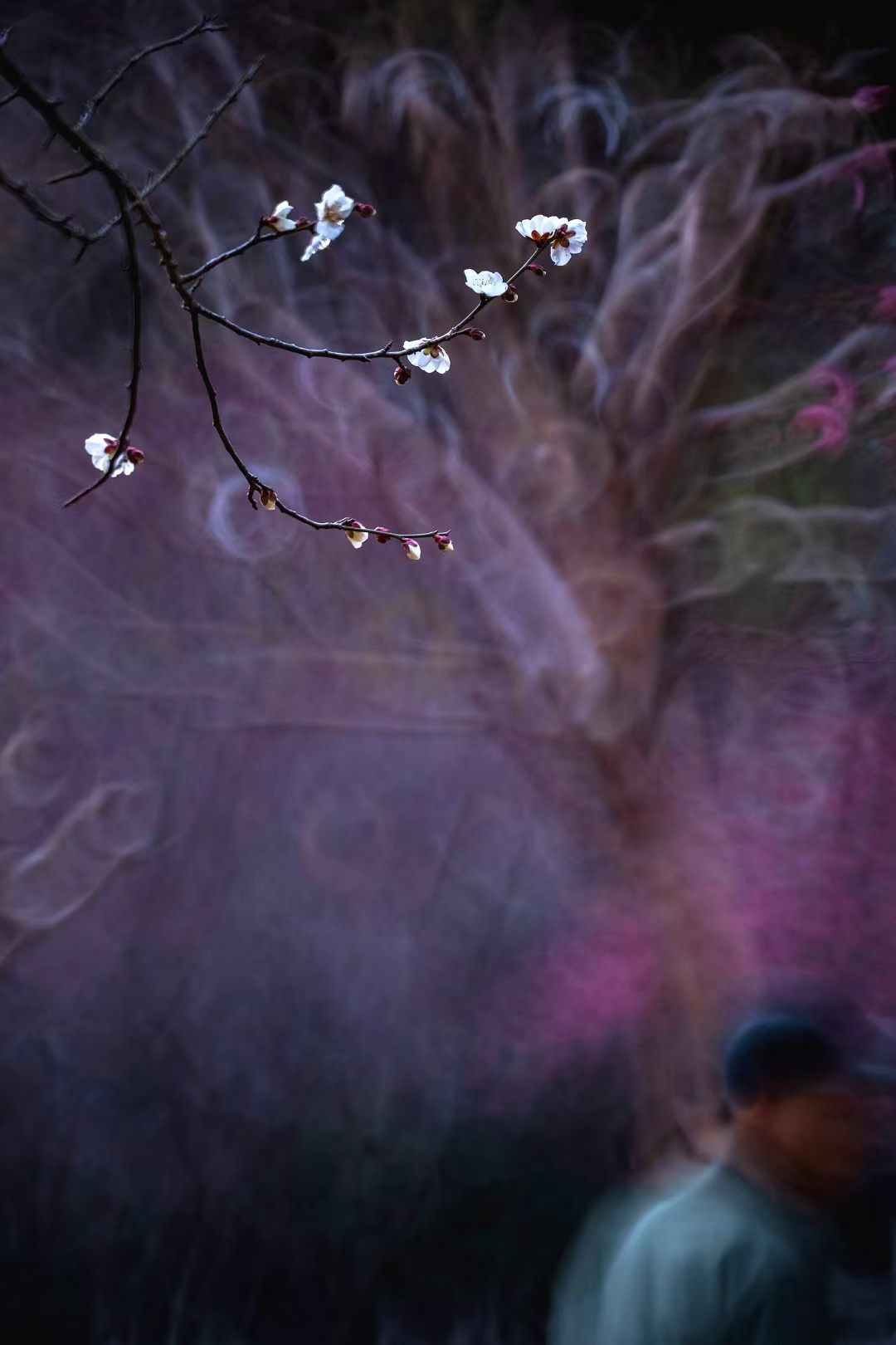 徜徉于梅园,色调幽微映衬的似梦似幻,给梅花笼上了一层神秘的纱。偶有模糊的人影闪过,更衬得梅花遗世独立。