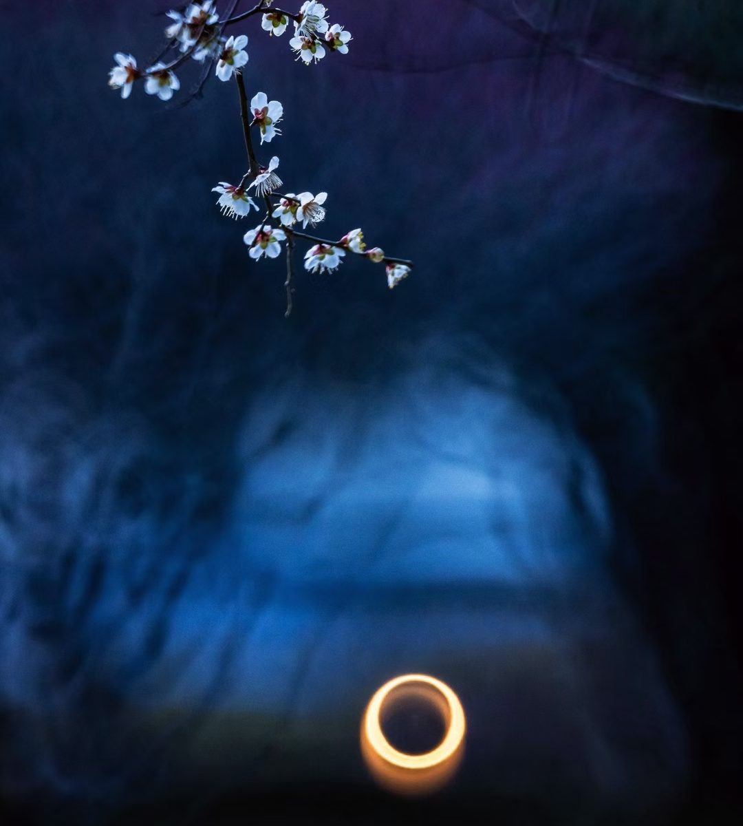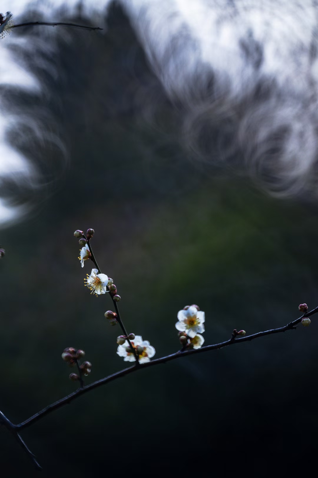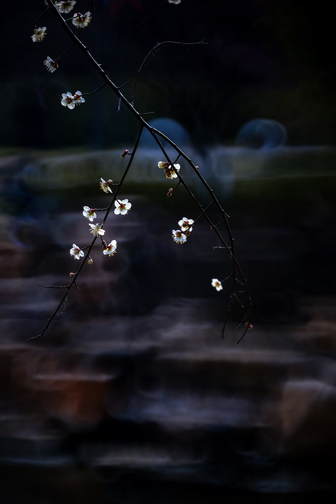 徜徉于梅园,色调幽微映衬的似梦似幻,给梅花笼上了一层神秘的纱。偶有模糊的人影闪过,更衬得梅花遗世独立。