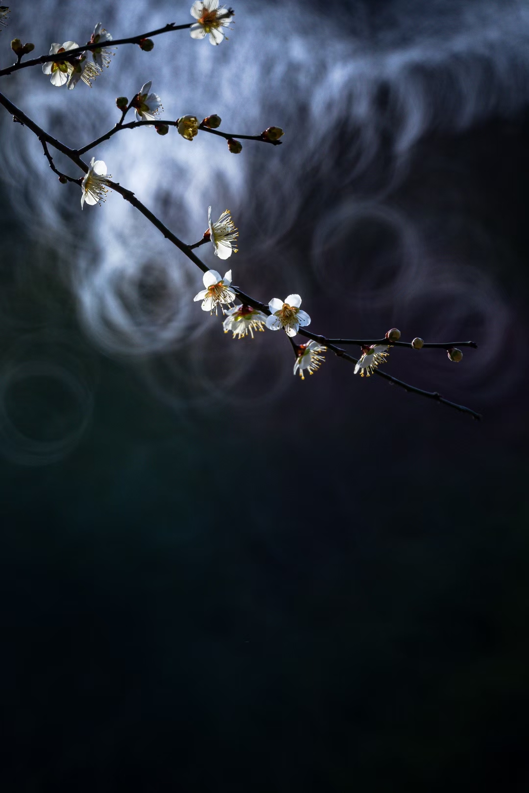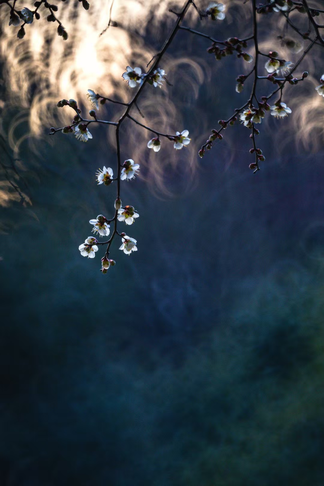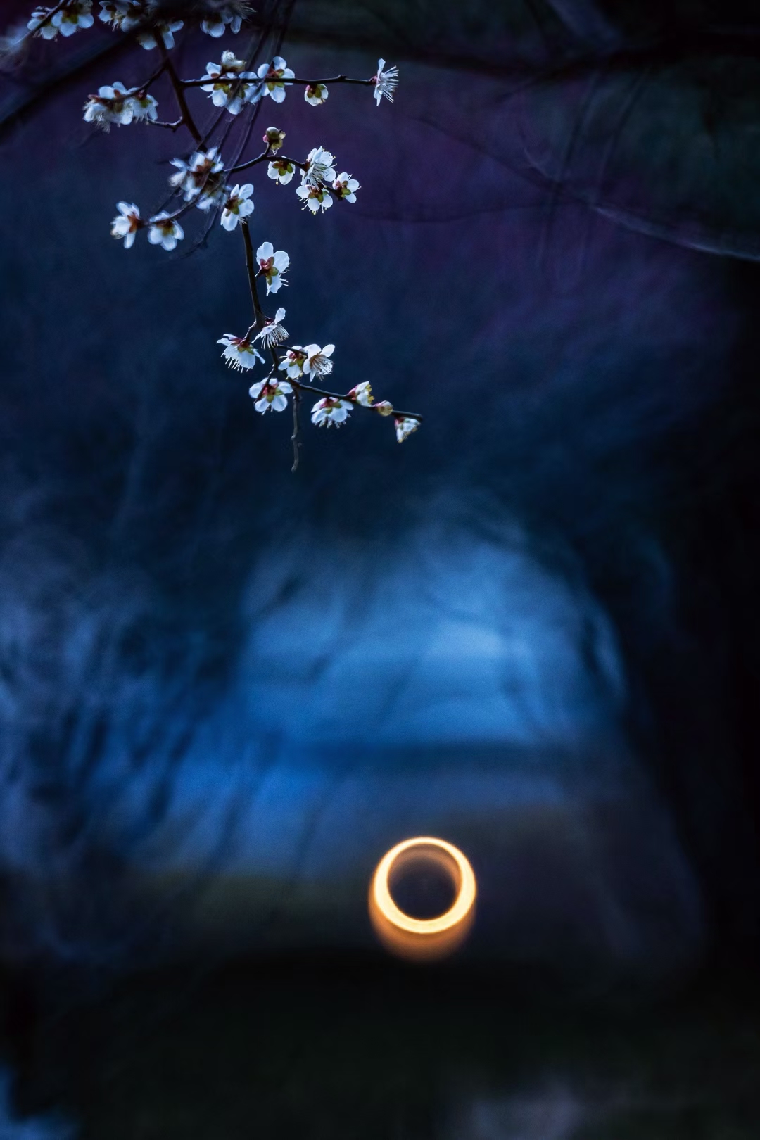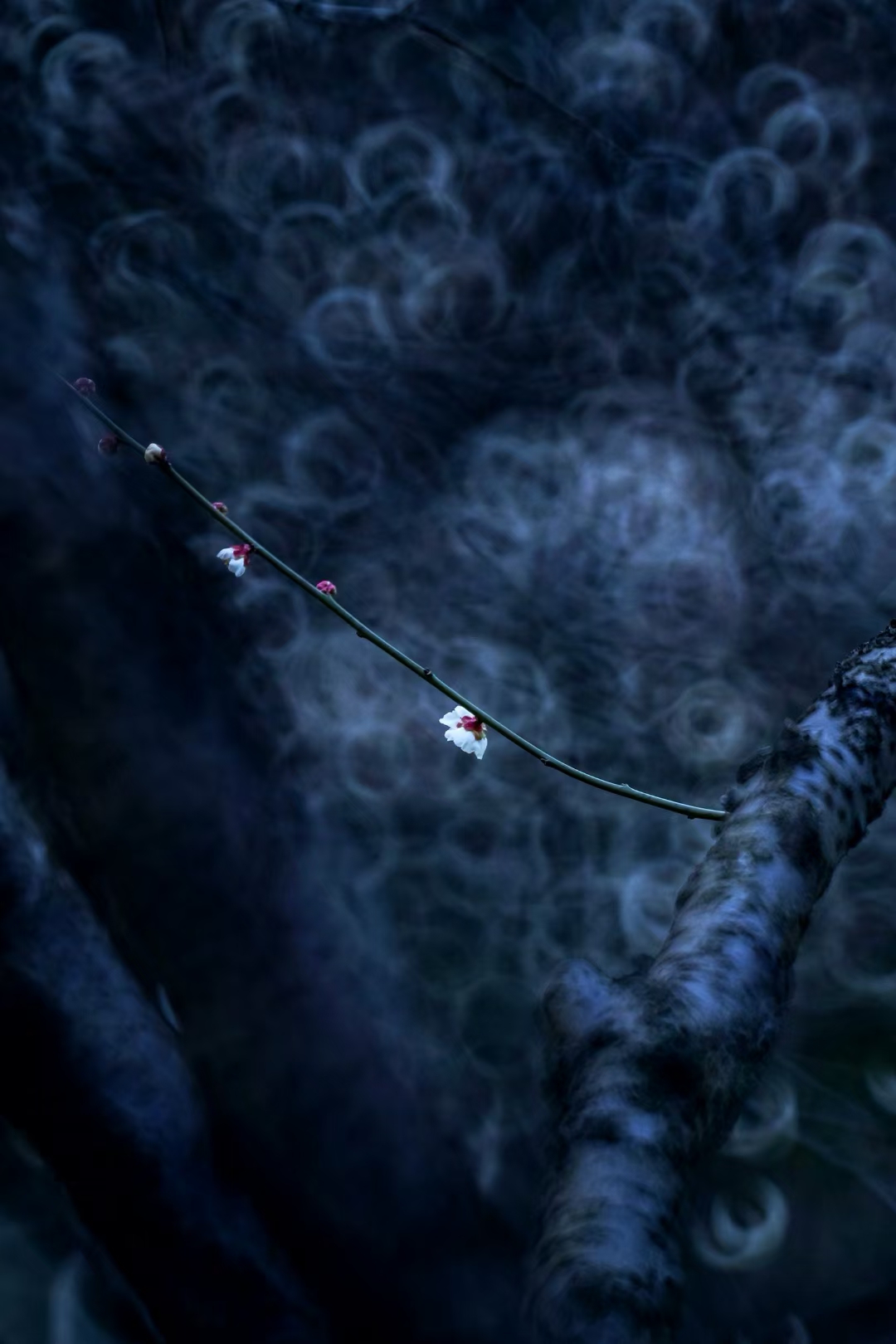 徜徉于梅园,色调幽微映衬的似梦似幻,给梅花笼上了一层神秘的纱。偶有模糊的人影闪过,更衬得梅花遗世独立。